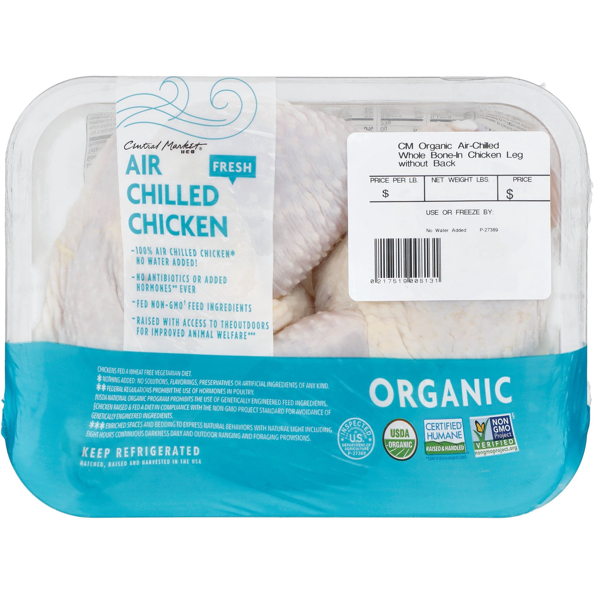 Individually air chilled for maximum flavor and tenderness, Central Market Organic Bone-in Whole Chicken Legs are packaged with no added water. That means there's no diluting of the naturally deliciou…
