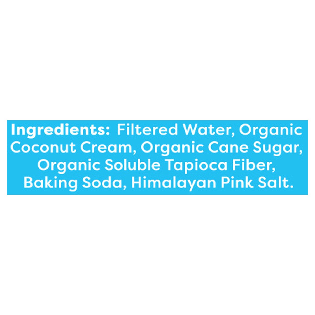 Filtered Water, Organic Coconut Cream, Organic Cane Sugar, Organic Soluble Tapioca Fiber, Baking Soda, Himalayan Pink Salt.