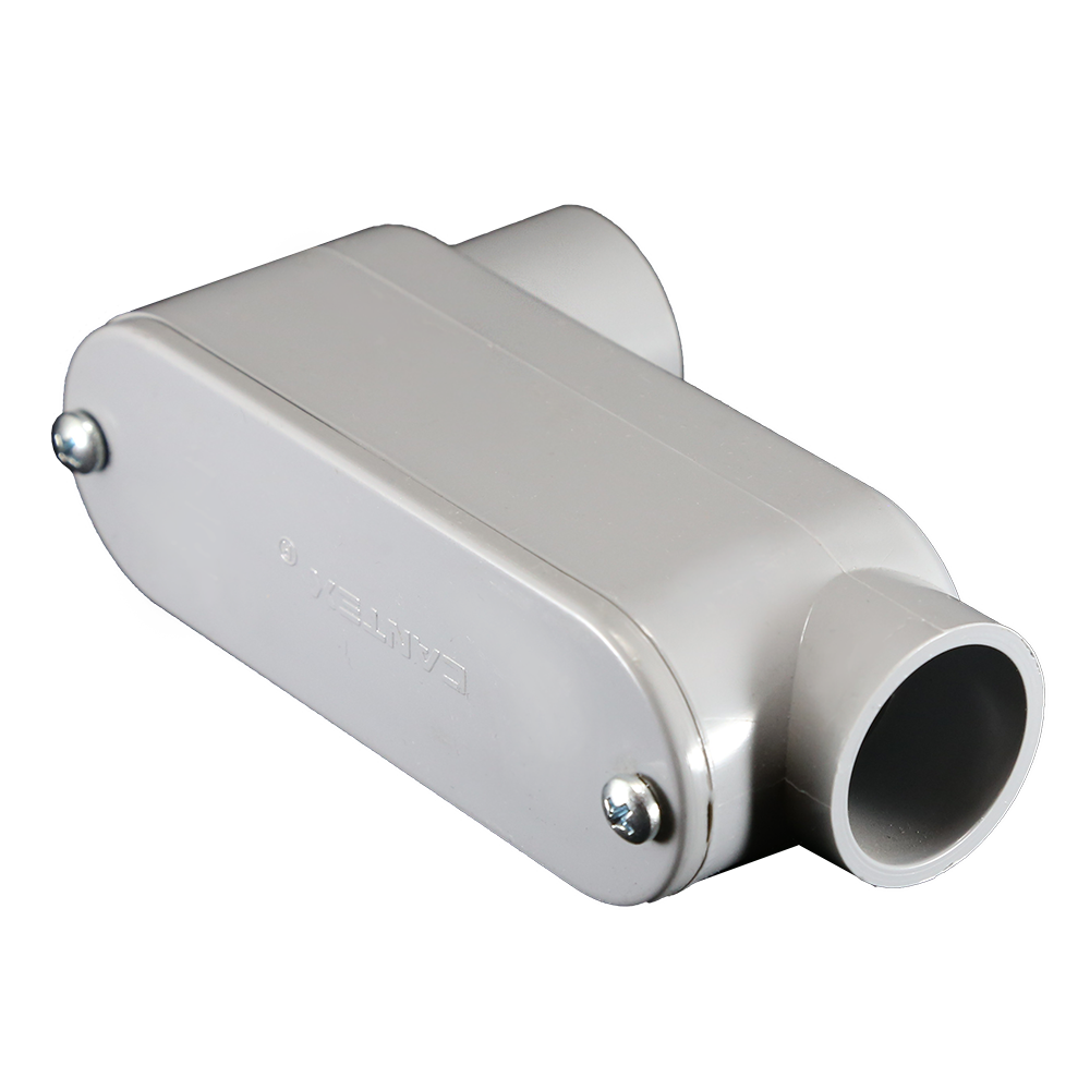 This product is used for a change of direction of the conduit run with the back hub usually exiting through a wall. One entrance hub is in one end wall of the fitting and the other hub is at the oppos…