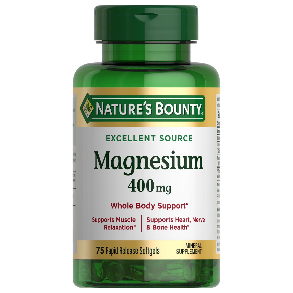 Nature''s Bounty Magnesium 400 Mg provides 100% of the daily recommended value for this important mineral in just one softgel. Magnesium is essential for supporting bone health, and plays an important…