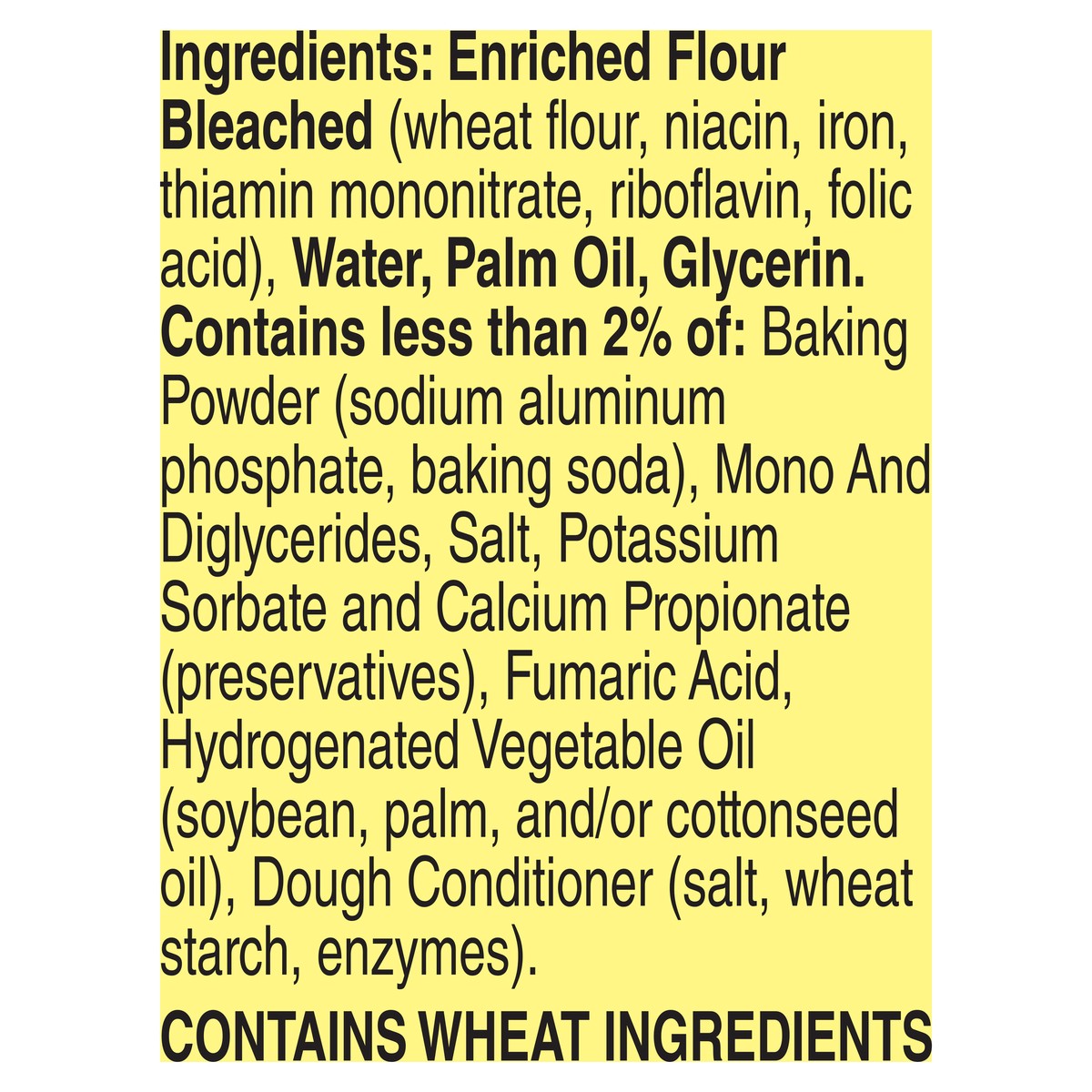 Enriched Flour Bleached (Wheat Flour, Niacin, Iron, Thiamin Mononitrate, Riboflavin, Folic Acid), Water, Palm Oil, Glycerin, Contains Less than 2% of: Baking Powder (Sodium Aluminum Phosphate, Baking …