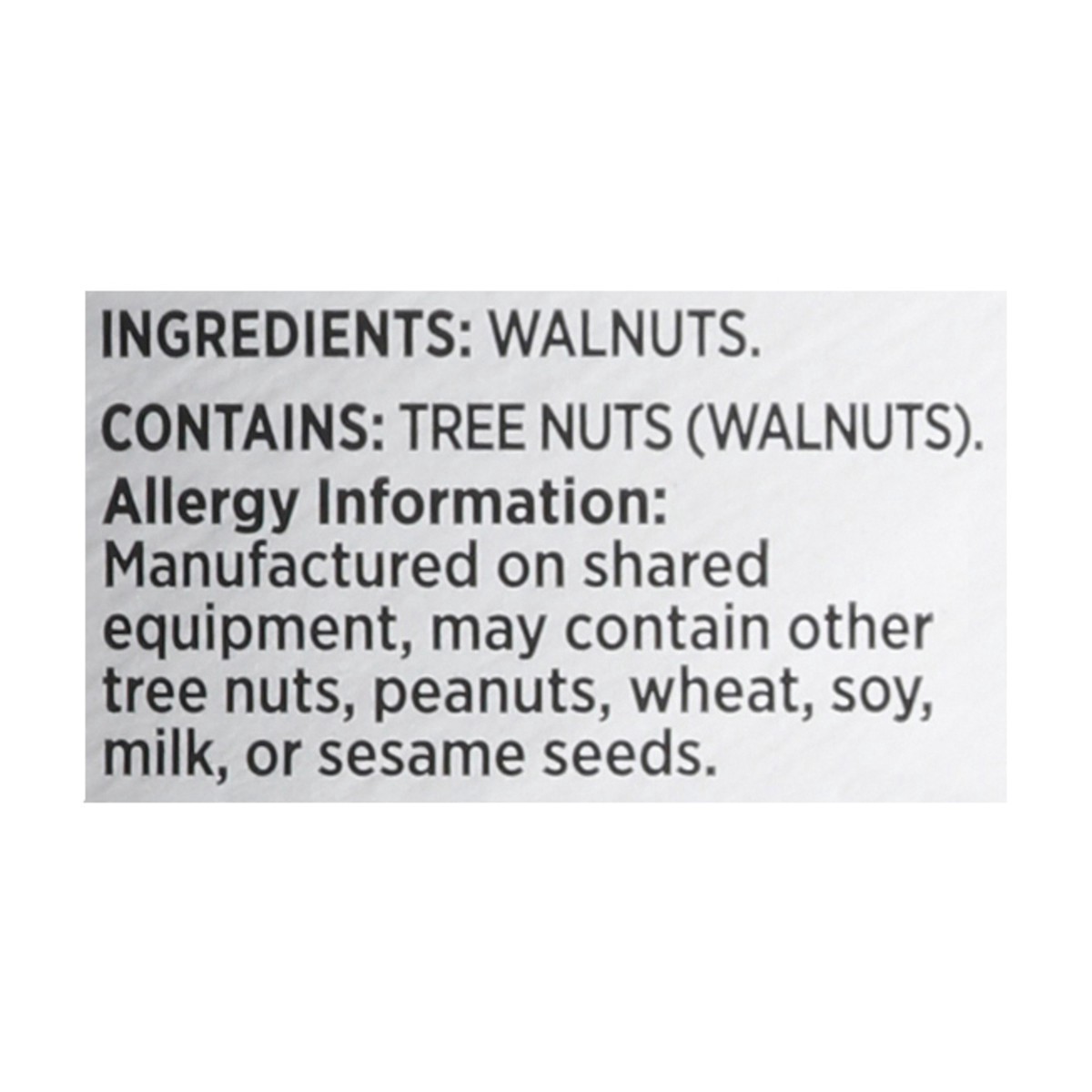 Contains: tree nuts (walnuts). allergy information: manufactured on shared equipment, may contain other tree nuts, peanuts, wheat, soy, milk, or sesame seeds.