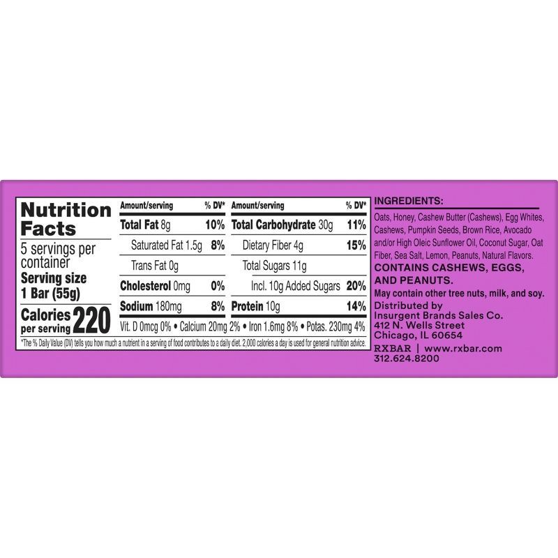 Oats, Honey, Cashew Butter (Cashews), Egg Whites, Cashews, Pumpkin Seeds, Brown Rice, Avocado and/or High Oleic Sunflower Oil, Coconut Sugar, Oat Fiber, Sea Salt, Lemon, Peanuts, Natural Flavors.