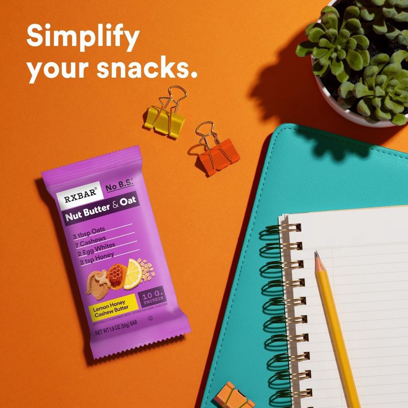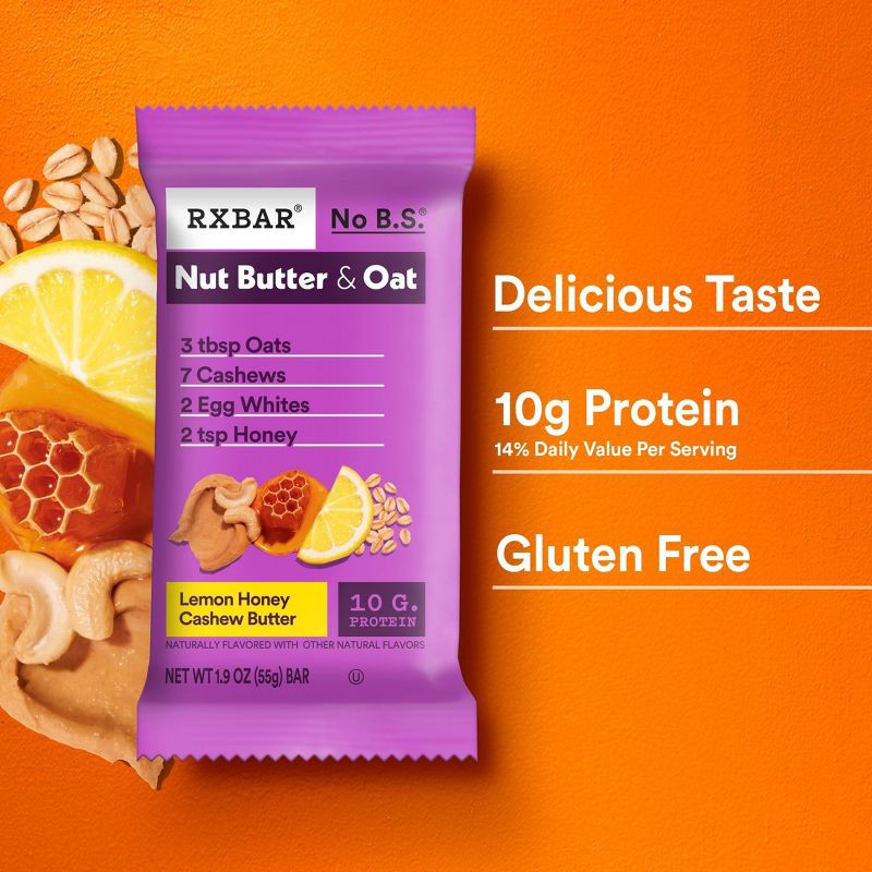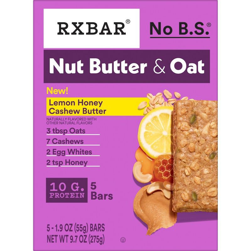 - Includes 1, 9.7oz box containing 5 RXBAR Nut Butter and Oat Lemon Honey Cashew Butter protein bars