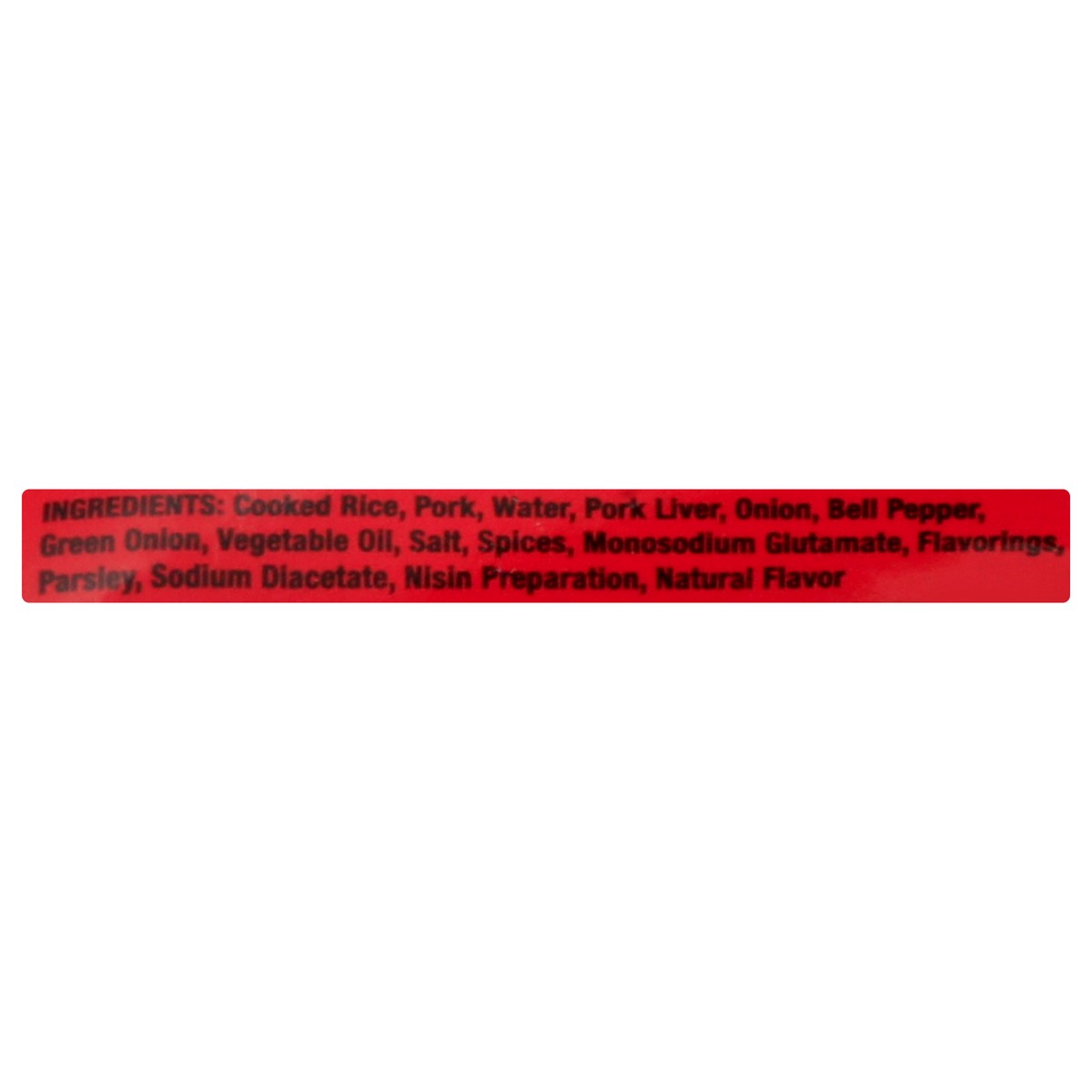 Cooked Rice, Pork, Water, Pork Liver, Onion, Bell Pepper, Green Onion, Vegetable Oil, Salt, Spices, Monosodium Glutamate, Flavorings, Parsley, Sodium Diacetate, Nisin Preparation, Natural Flavor.