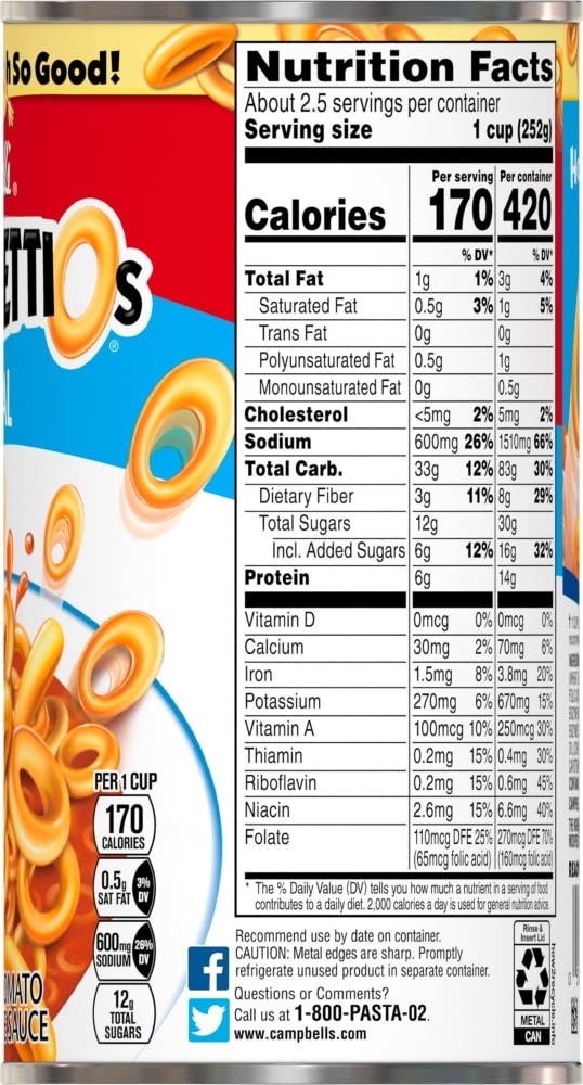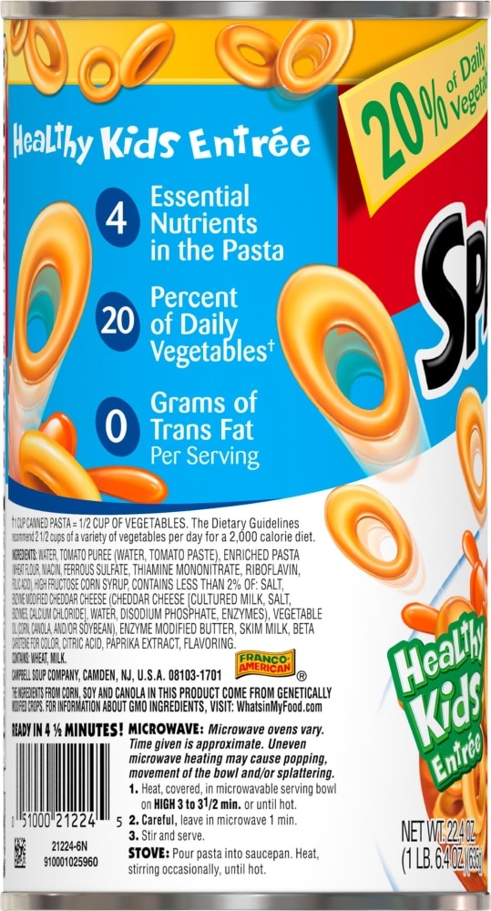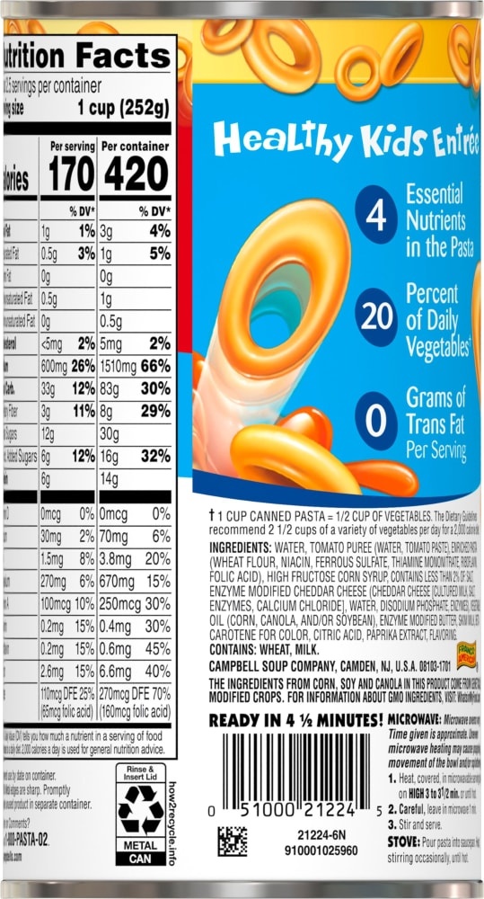 - Canned pasta with 20% of your daily vegetables* (sneaky!),and four essential nutrients in the pasta *(1 cup of canned pasta = 1/2 cup vegetables)