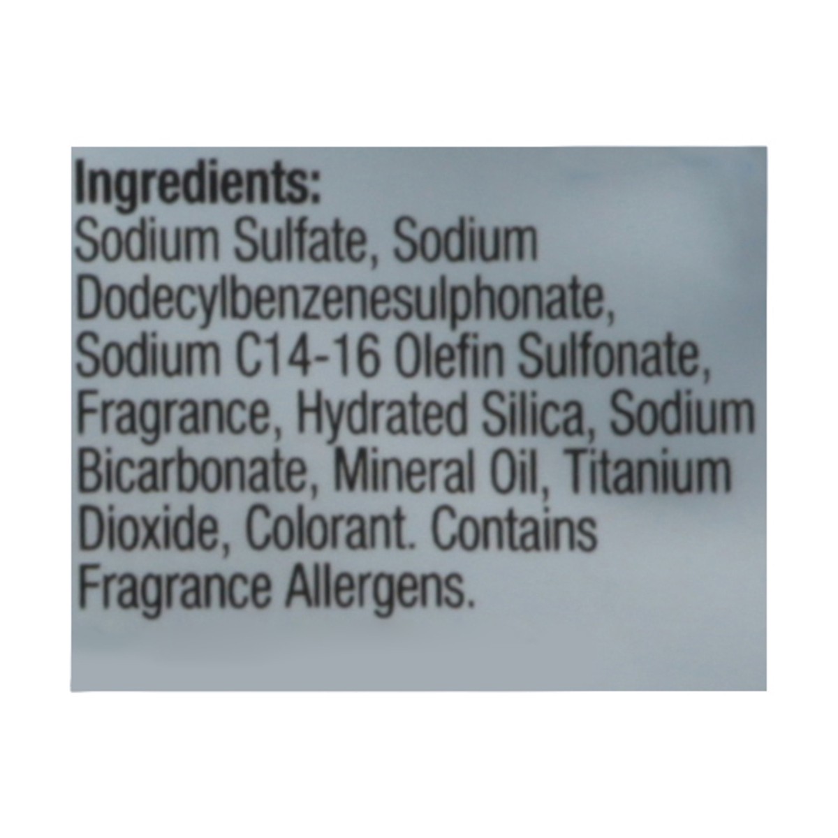 Sodium Sulfate, Sodium Dodecylbenzenesulphonate, Sodium C14-16 0olefin Sulfonate, Fragrance, Hydrated Silica, Sodium Bicarbonate, Mineral Oil, Titanium Dioxide, Colorant.