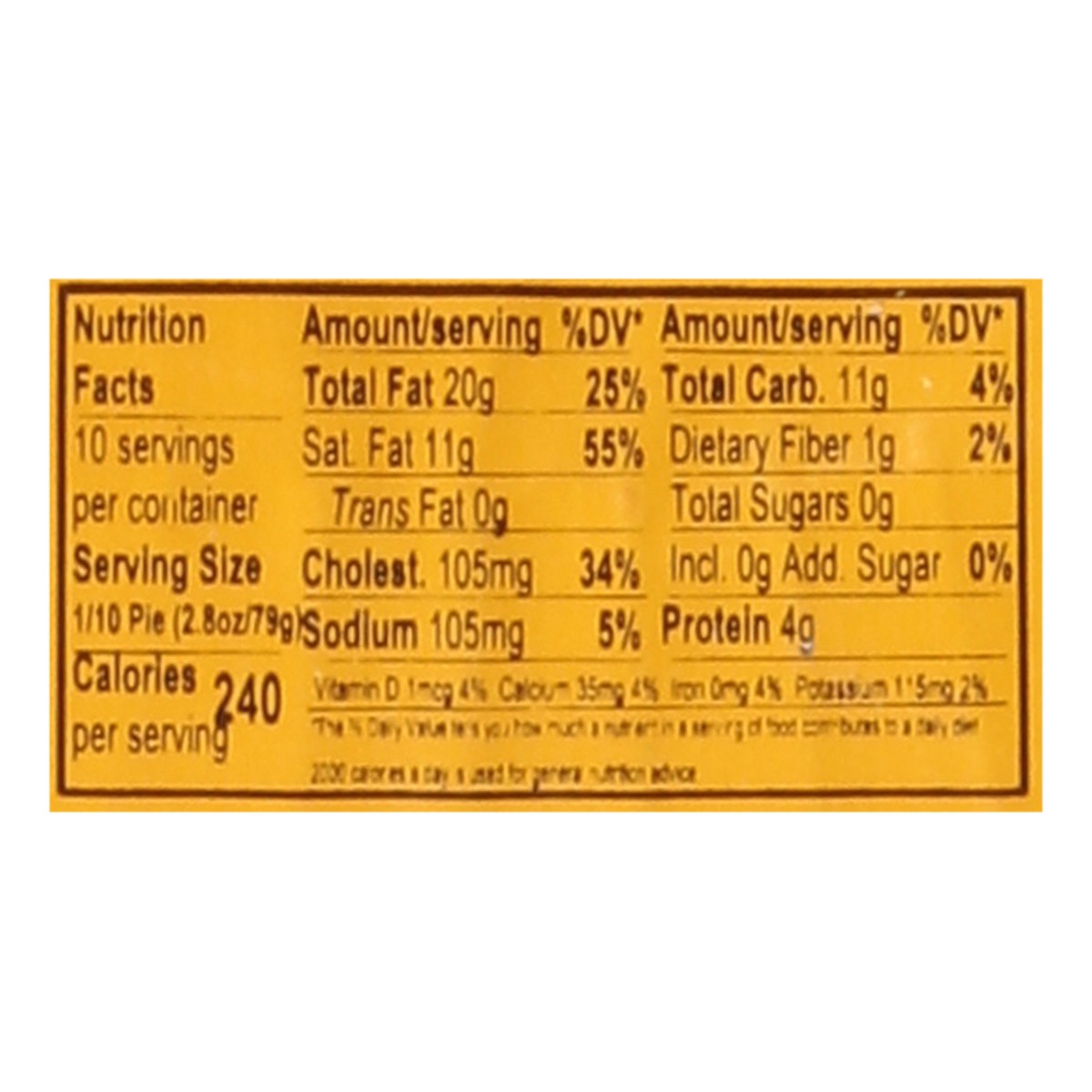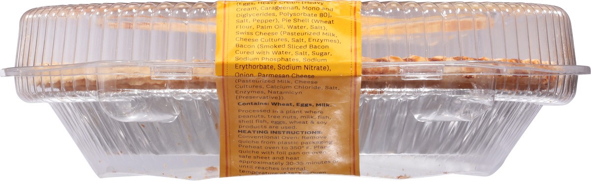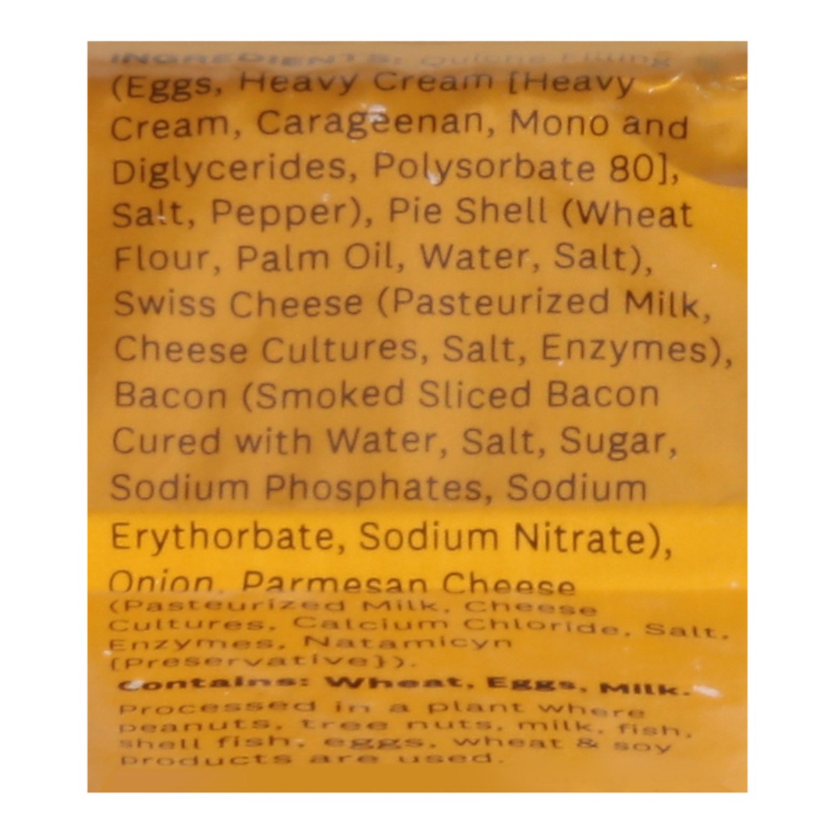 Quiche Filling (Eggs, Heavy Cream [Heavy Cream, Carrageenan, Mono and Diglycerides, Polysorbate 80], Salt, Pepper), Pie Shell (Wheat Flour, Palm Oil, Water, Salt), Swiss Cheese (Pasteurized Milk, Cheeā¦