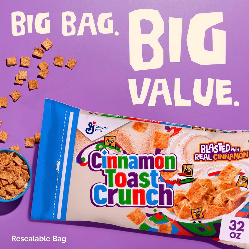 - CONTAINS: One plastic bag of crunchy Cinnamon Toast Crunch Breakfast Cereal, Crispy Cinnamon Cereal, Value Bag, 32 oz; Perfect for instant snacking, or a part of breakfast and meals