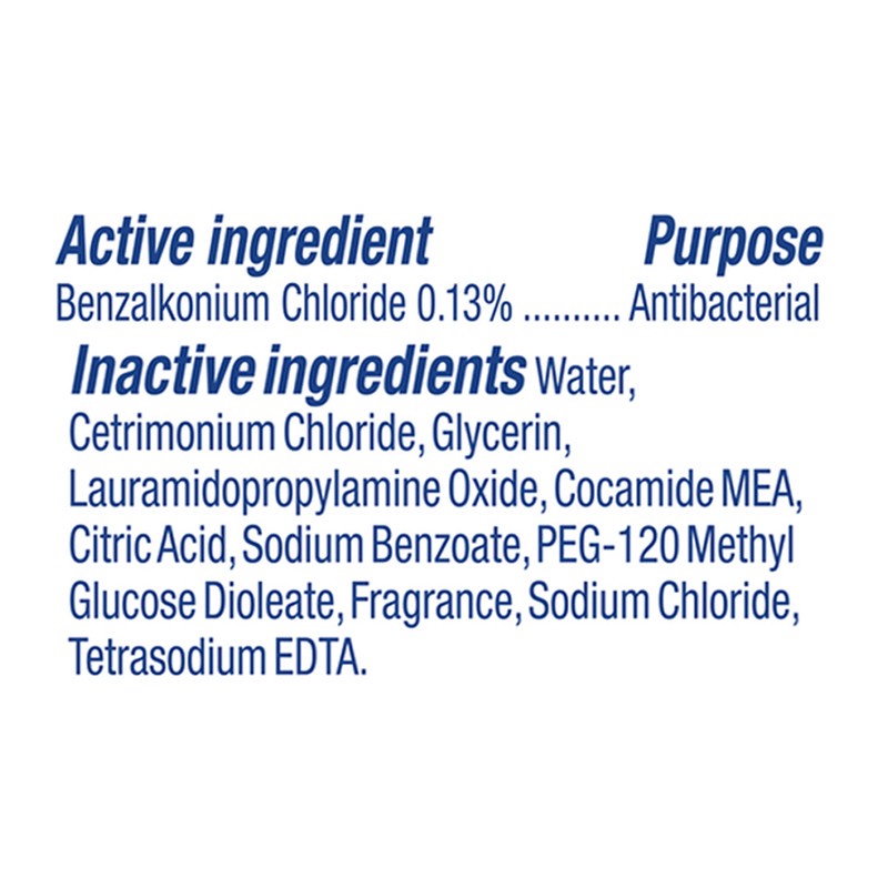 Active Ingredients: Benzalkonium Chloride (0.13 %), Antibacterial. Inactive Ingredients: Water, Cetrimonium Chloride, Glycerin, Lauramidopropylamine Oxide, Cocamide MEA, Citric Acid, Sodium Benzoate, …