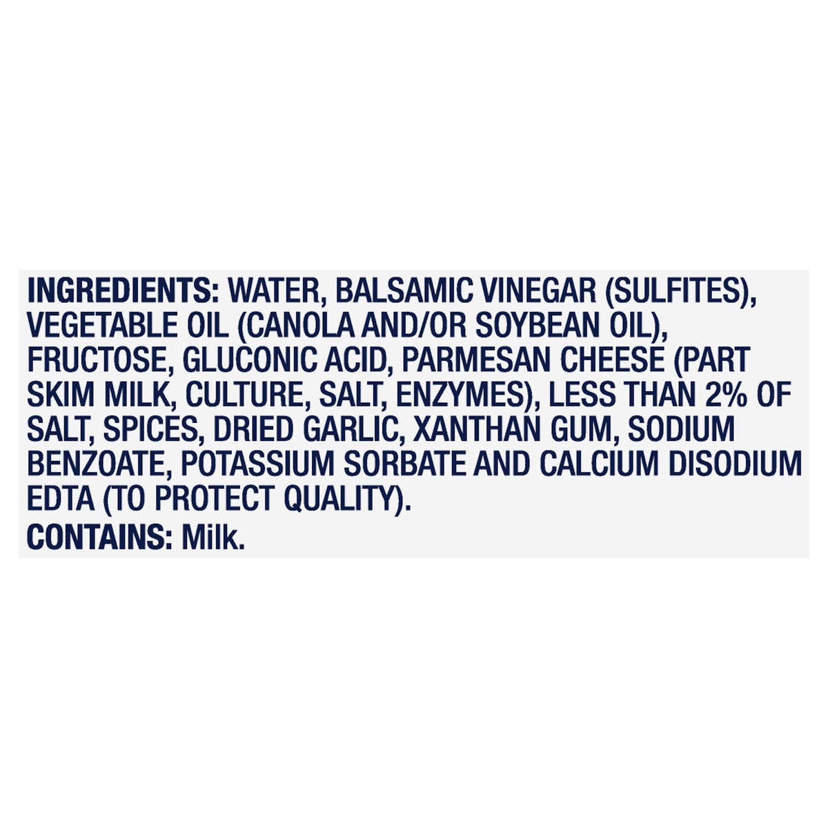 Water\, Balsamic Vinegar (Sulfites)\, Vegetable Oil (Canola and/or Soybean Oil)\, Fructose\, Gluconic Acid\, Parmesan Cheese (Part Skim Milk\, Culture\, Salt\, Enzymes)\, Less than 2% of Salt\, Spices…