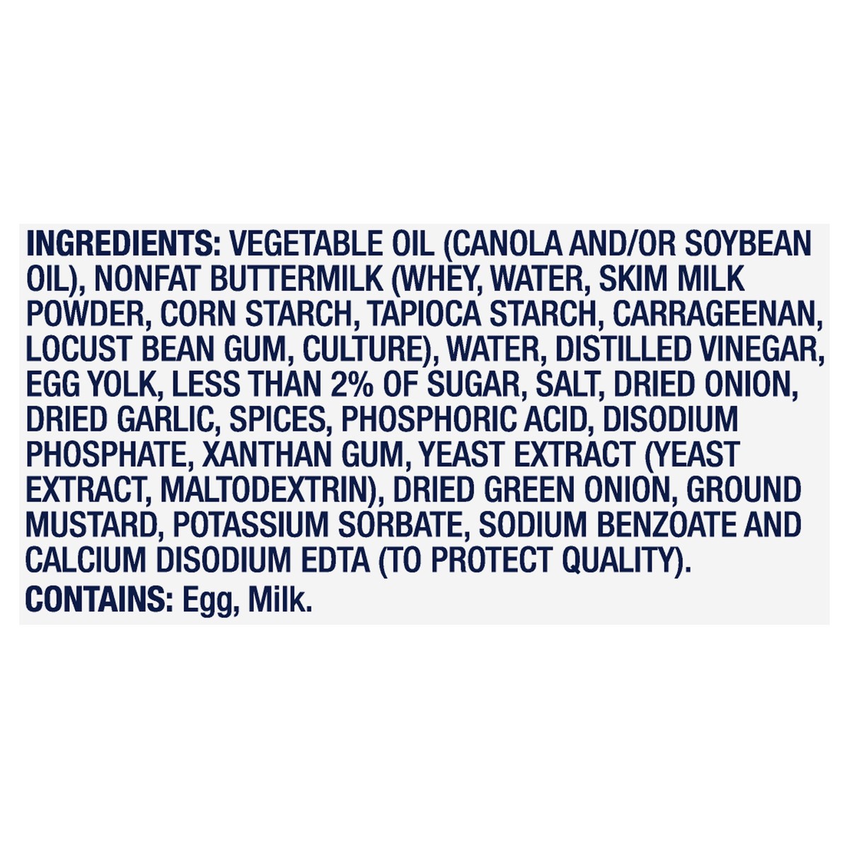 Vegetable Oil (Canola and/or Soybean Oil), Nonfat Buttermilk (Whey, Water, Skim Milk Powder, Corn Starch, Tapioca Starch, Carrageenan, Locust Bean Gum, Culture), Water, Distilled Vinegar, Egg Yolk, Le…