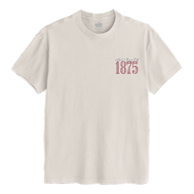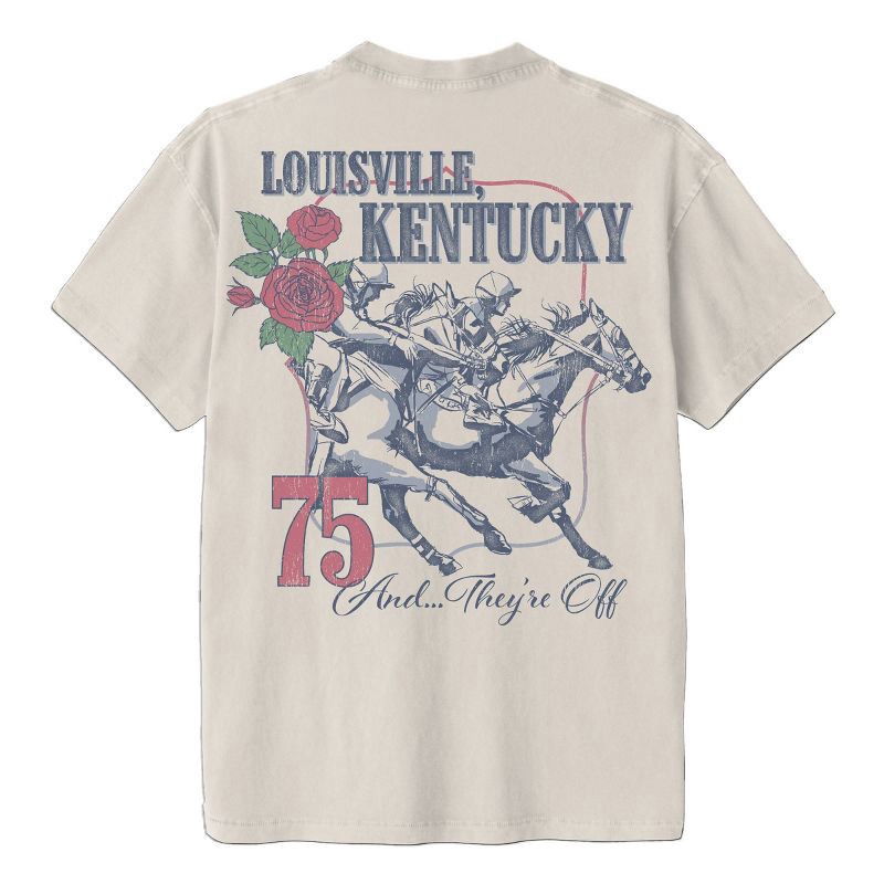 Celebrate the excitement of the legendary horse race with this Kentucky Derby Short-Sleeve Graphic T-Shirt. This off-white tee features vintage-finish "Louisville Kentucky" and "And...they're Off" tex…