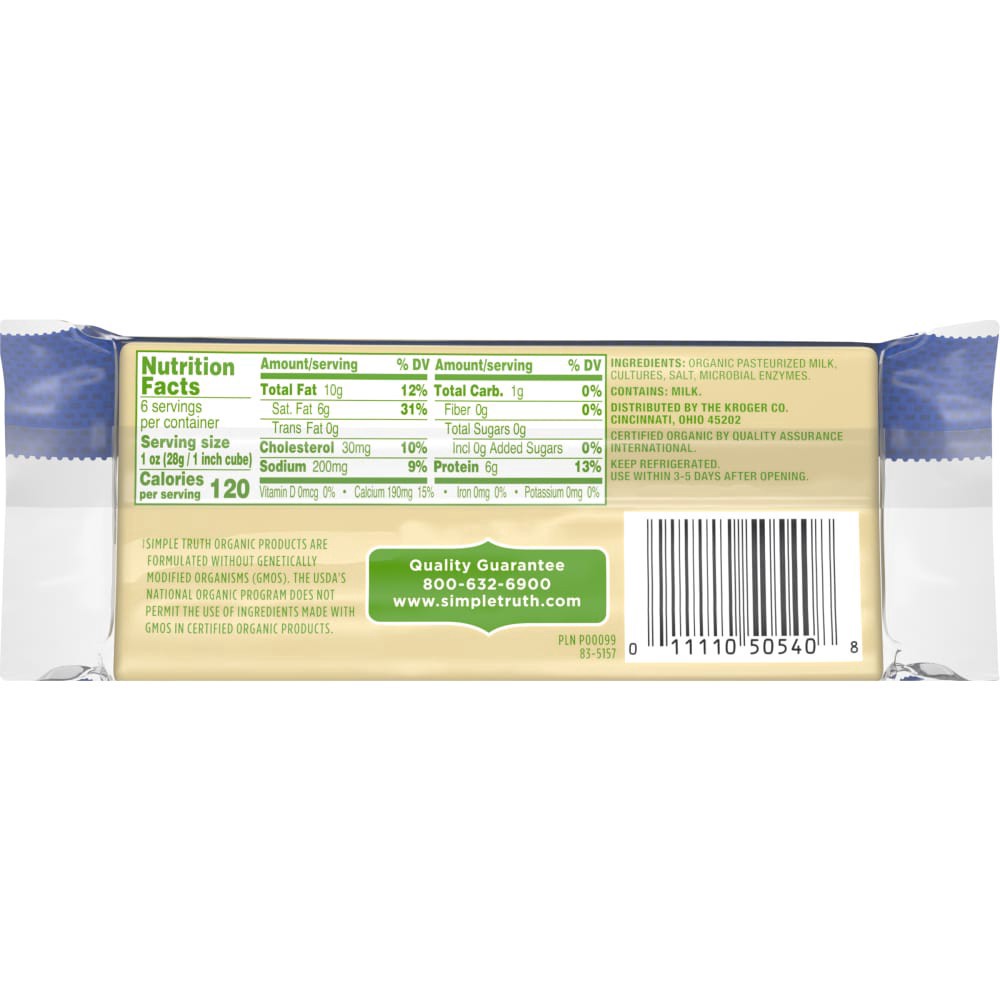Simple Truth Organic® Sharp White Cheddar Block Cheese offers a delicious, full flavor. Made from USDA organic pasteurized milk, cultures, and a hint of salt, it's a taste of creamy goodness. A good s…