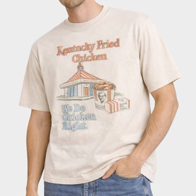 Serve up some classic American flavor with this Kentucky Fried Chicken Graphic T-Shirt. This natural oatmeal-hued tee features a vintage-finish KFC restaurant with red-and-white striped roof and signa…