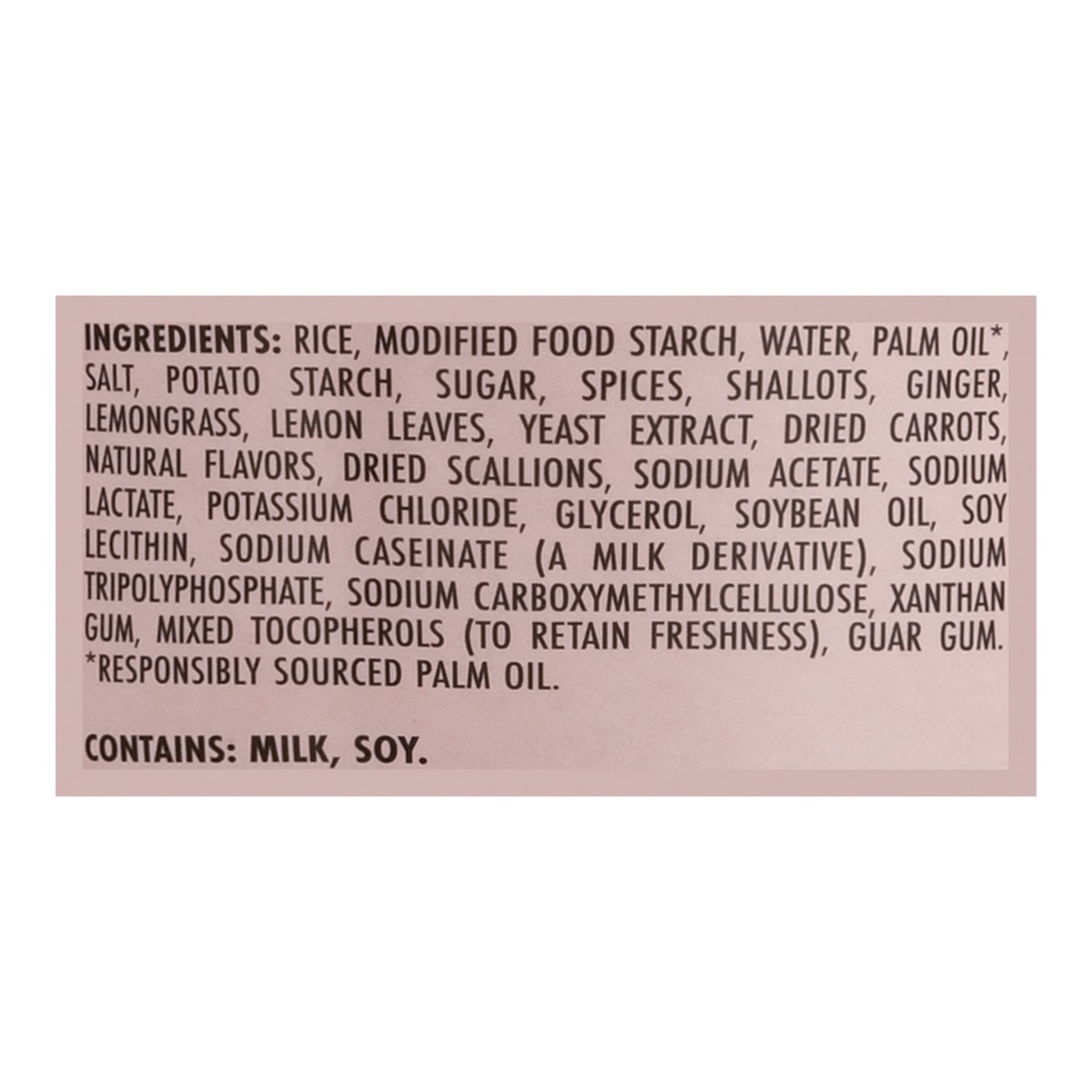 Rice, Modified Food Starch, Water, Palm Oil*, Salt, Potato Starch, Sugar, Spices, Shallots, Ginger, Lemongrass, Lemon Leaves, Yeast Extract, Dried Carrots, Natural Flavors, Dried Scallions, Sodium Ace…