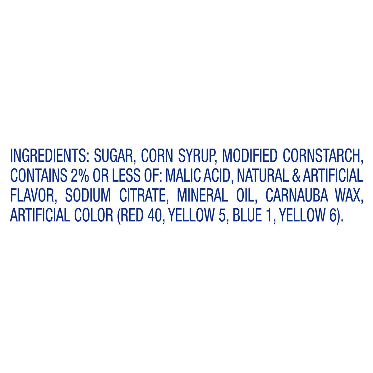 Sugar, Corn Syrup, Modified Cornstarch, Contains 2% or Less of: Malic Acid, Natural & Artificial Flavor, Sodium Citrate, Mineral Oil, Carnauba Wax, Artificial Color (Red 40, Yellow 5, Blue 1, Yellow 6…