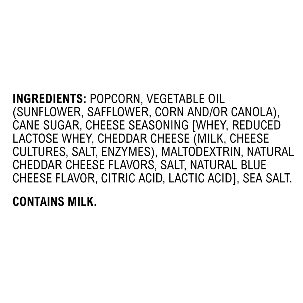 Popcorn, Vegetable Oil (Sunflower, Safflower, Corn and/or Canola), Cane Sugar, Cheese Seasoning [Whey, Reduced Lactose Whey, Cheddar Cheese (Milk, Cheese Cultures, Salt, Enzymes), Maltodextrin, Natura…