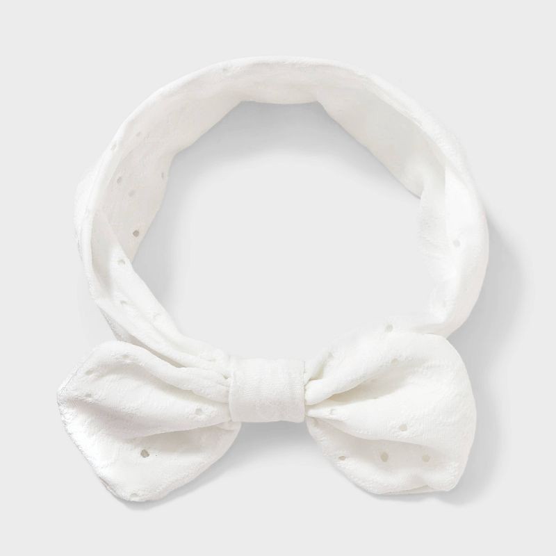 - White floral eyelet fabric headband with large bow