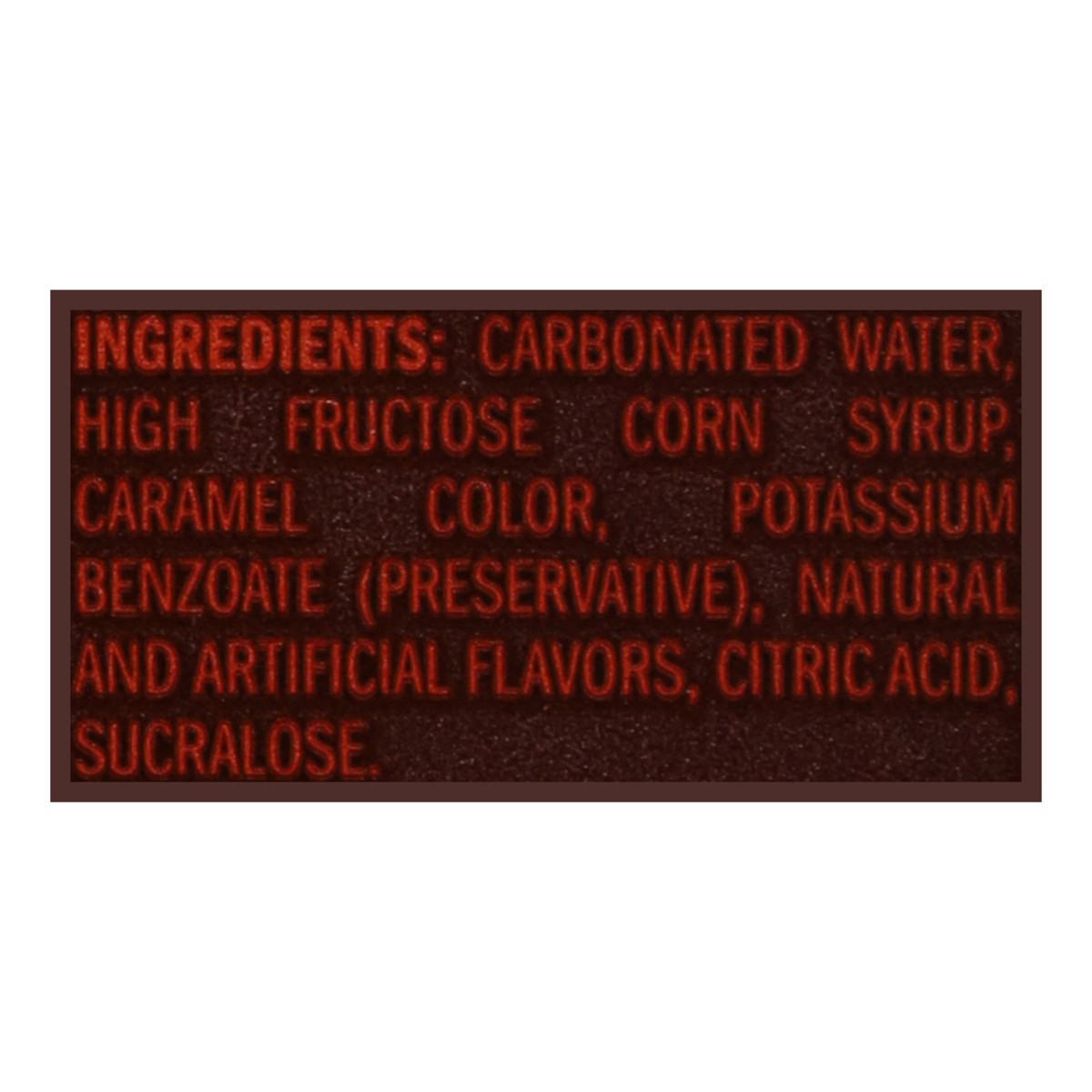 Carbonated Water, High Fructose Corn Syrup, Caramel Color, Potassium Benzoate (Preservative), Natural and Artificial Flavors, Citric Acid, Sucralose.