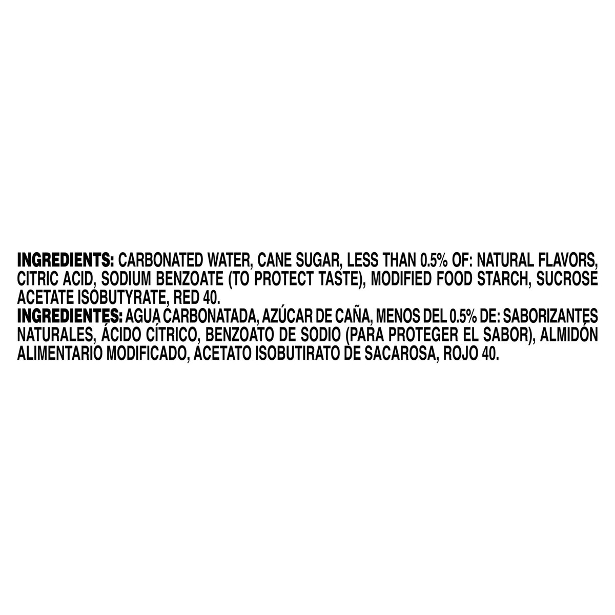 Carbonated Water, Cane Sugar, Less than 0.5% of: Natural Flavors, Citric Acid, Sodium Benzoate (to Protect Taste), Modified Food Starch, Sucrose Acetate Isobutyrate, Red 40.