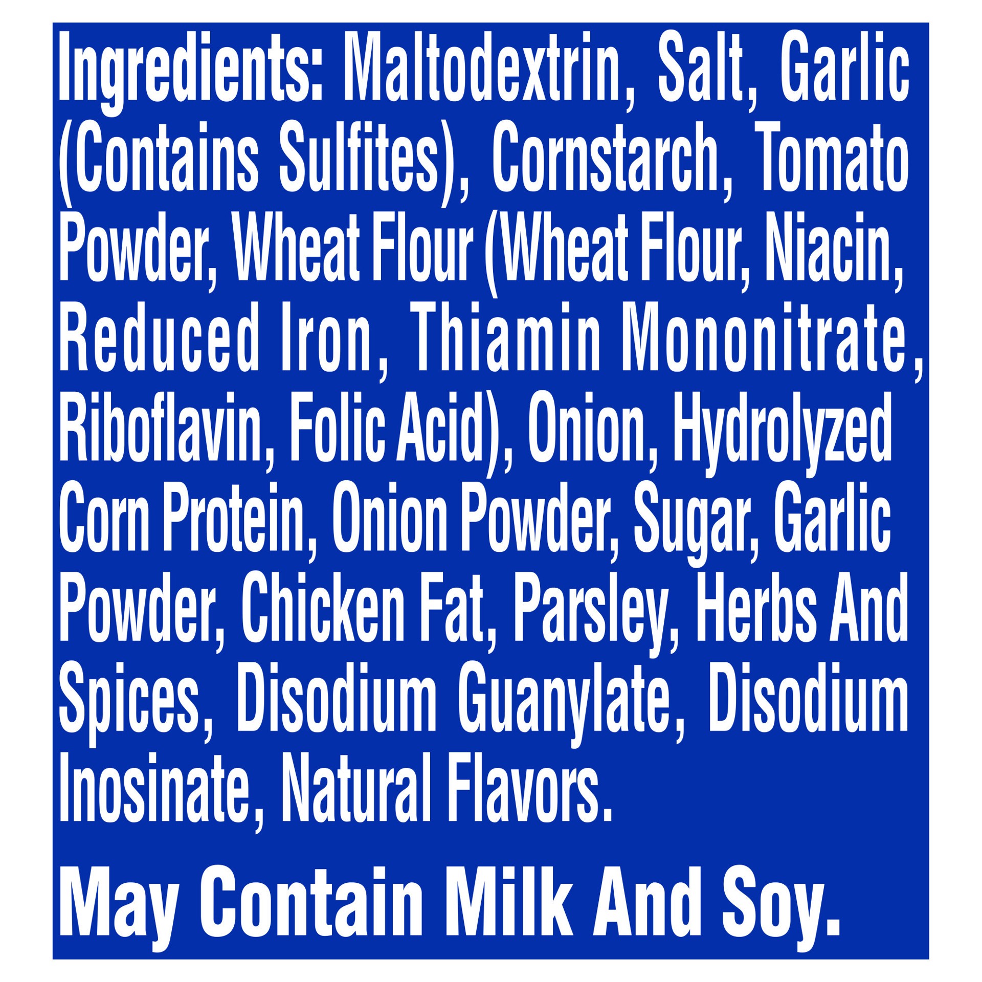 Maltodextrin, Salt, Garlic (Dehydrated) (Sulfites), Corn Starch, Tomato Powder, Wheat Flour (Wheat Flour, Niacin, Reduced Iron, Thiamin Mononitrate, Riboflavin, Folic Acid), Onions (Dehydrated), Hydro…