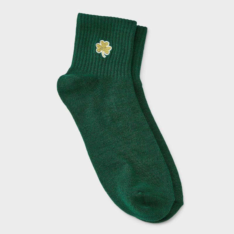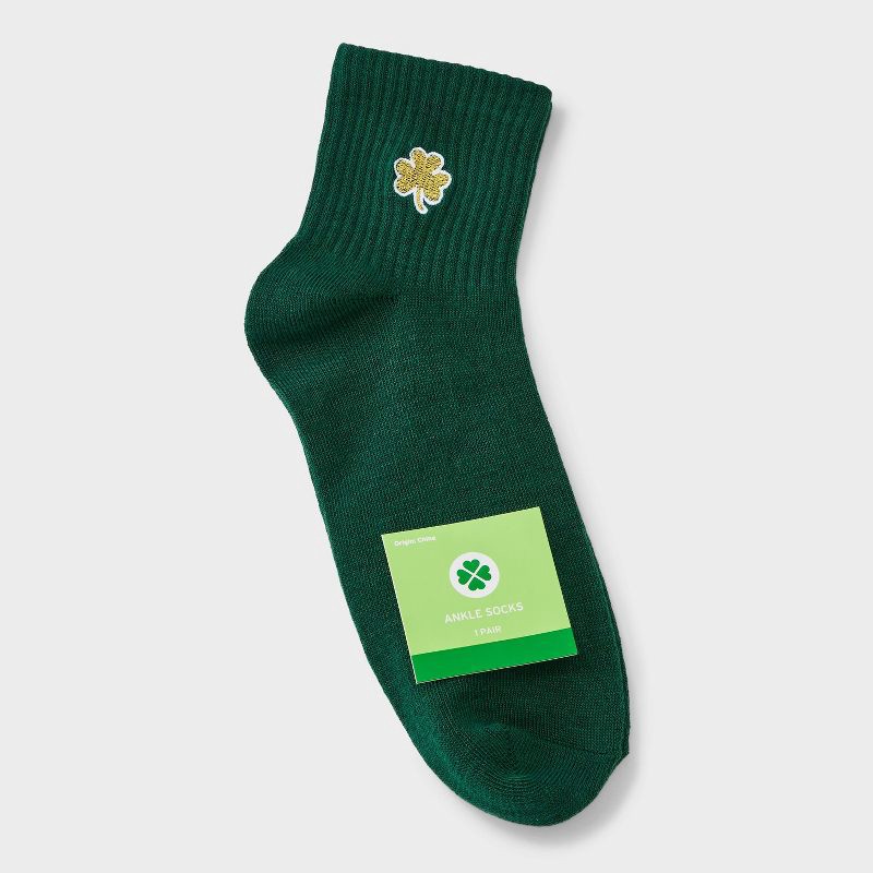 Step into festive flair with these Women's Embroidered Shamrock Ribbed St. Patrick's Day Ankle Socks - Green/Gold 4-10. Crafted from a blend of recycled polyester and spandex, these socks promise comf…