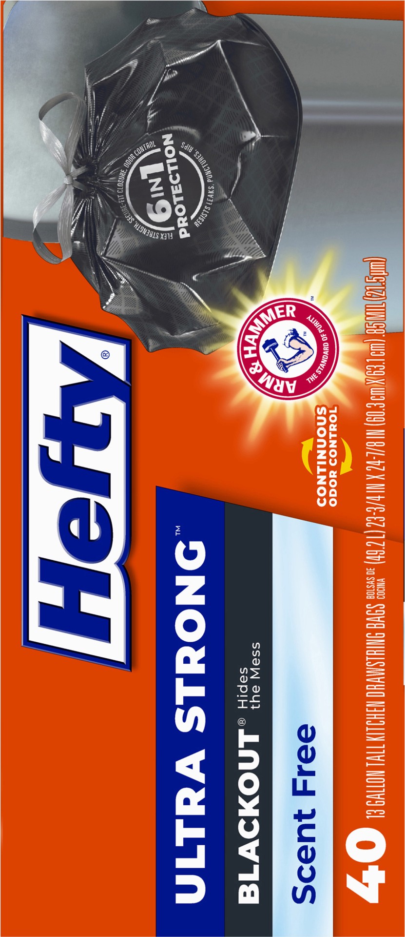 Trust Hefty Ultra Strong 13 Gallon Trash Bags to keep your kitchen waste contained—all the way from the can to the curb. Thanks to Triple-Action Technology, these tall kitchen garbage bags resist punc…