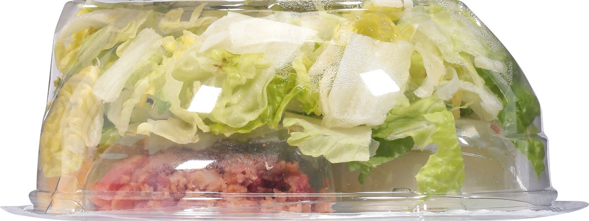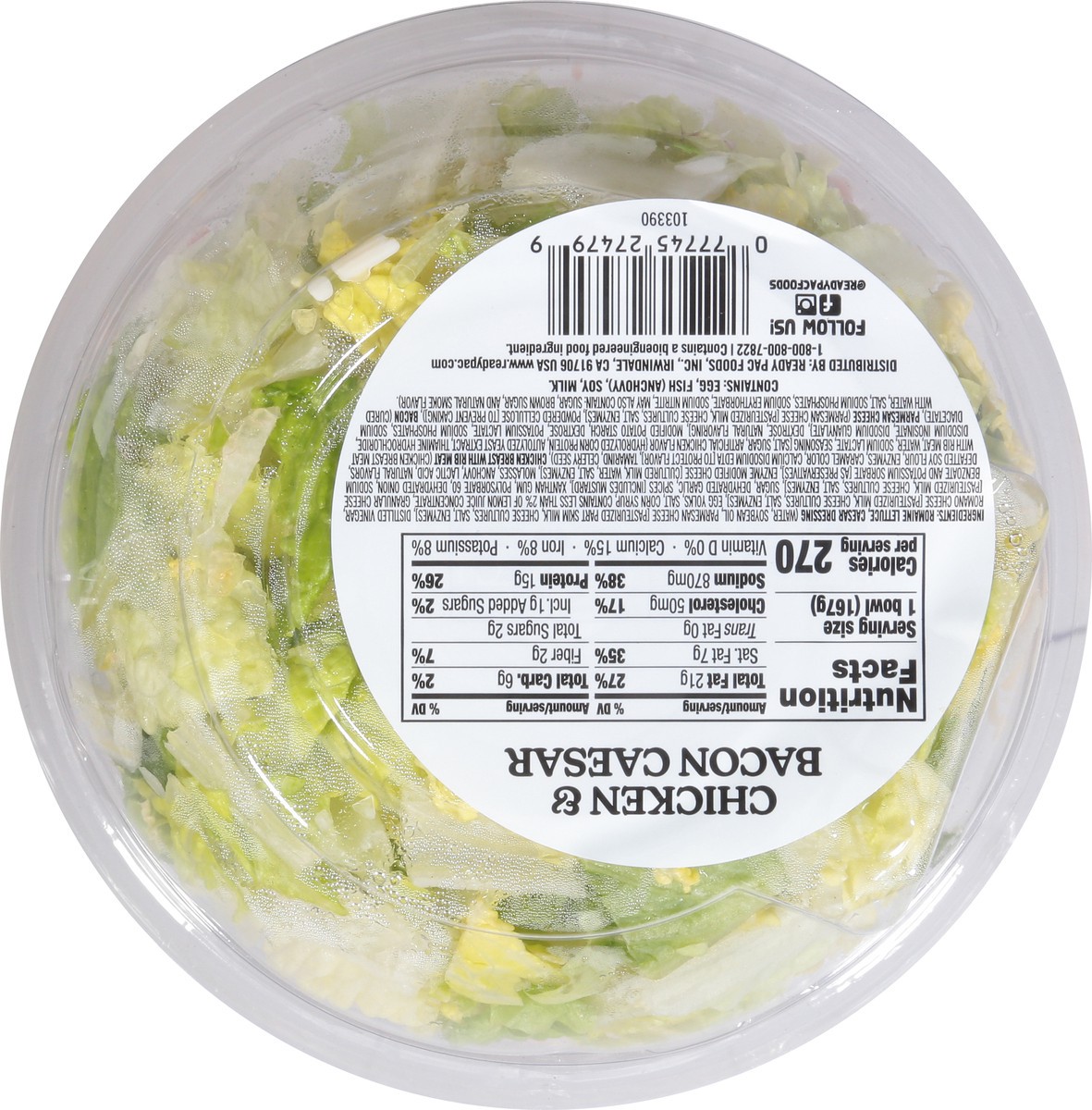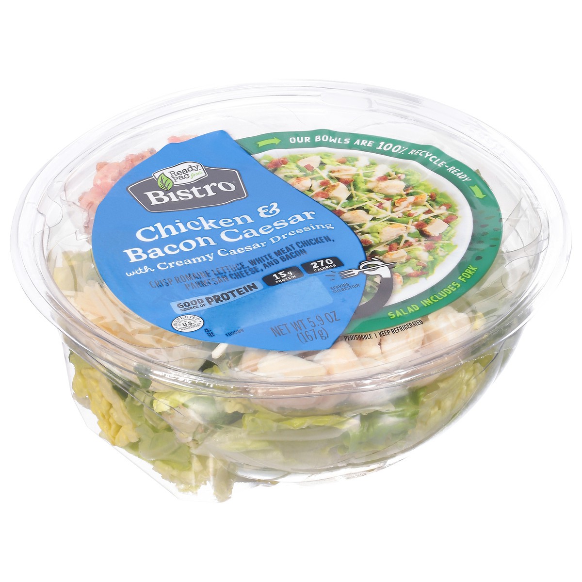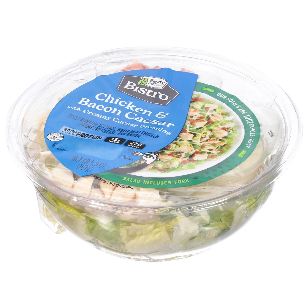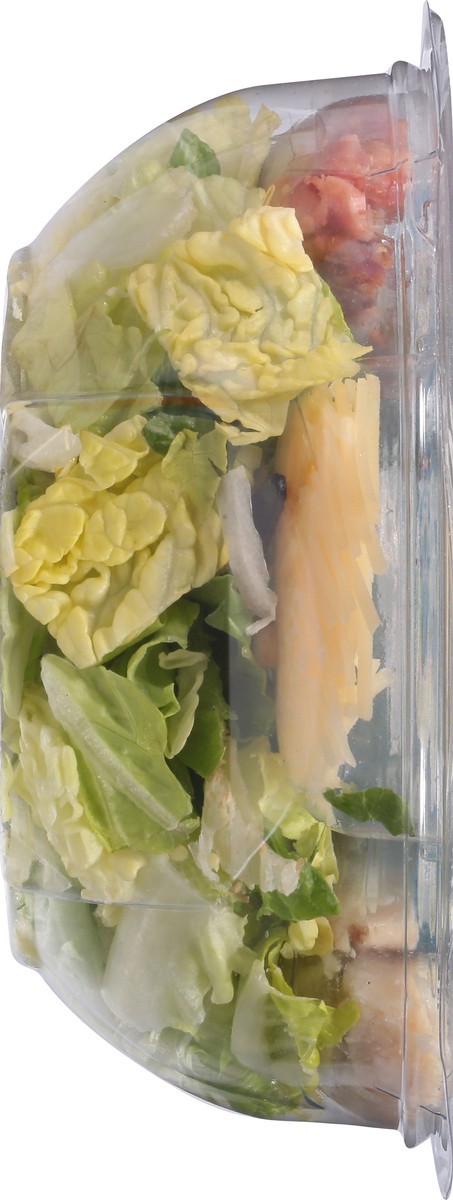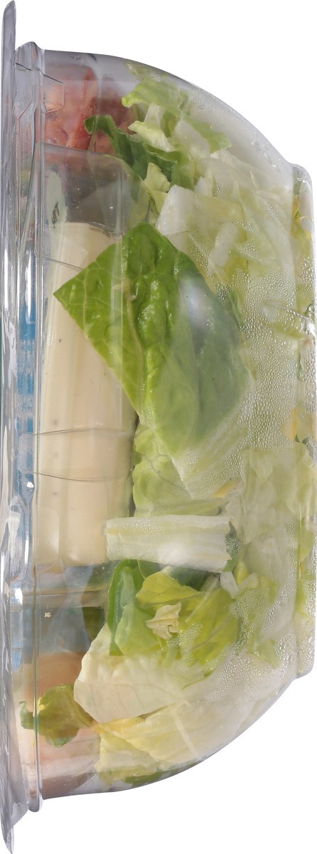 Crisp romaine lettuce, white meat chicken, parmesan cheese, and bacon. 15 g protein. 270 calories. Good source of protein. Contains a bioengineered food ingredient. Salad includes fork. Inspected for …