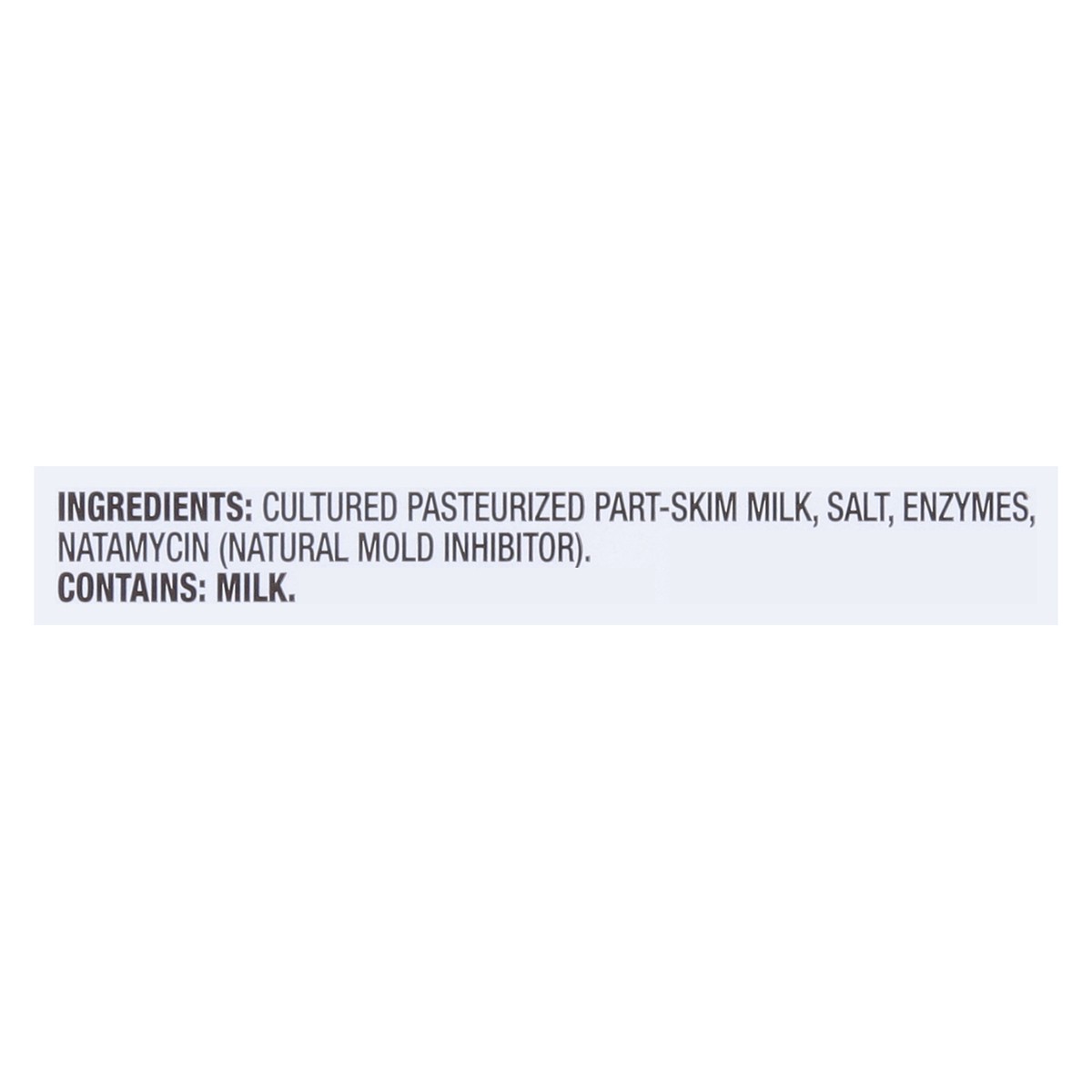 Cultured Pasteurized Part-Skim Milk, Salt, Enzymes, Natamycin (Natural Mold Inhibitor).
