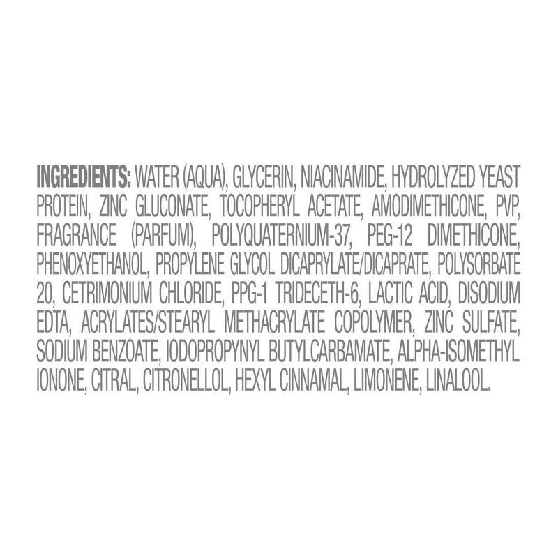Water (Aqua), Glycerin, Niacinamide, Hydrolyzed Yeast Protein, Zinc Gluconate, Tocopheryl Acetate, Amodimethicone, PVP, Fragrance, Polyquaternium-37, PEG-12 Dimethicone, Phenoxyethanol, Propylene Glyc…