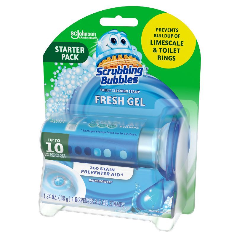 Scrubbing Bubbles® Fresh Gel Toilet Cleaning Stamp provides freshness with every flush. Simply stamp one of the Rainshower scented toilet bowl cleaner gel discs under the rim. Each automatic toilet cl…