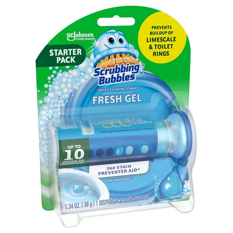 Scrubbing Bubbles® Fresh Gel Toilet Cleaning Stamp provides freshness with every flush. Simply stamp one of the Rainshower scented toilet bowl cleaner gel discs under the rim. Each automatic toilet cl…