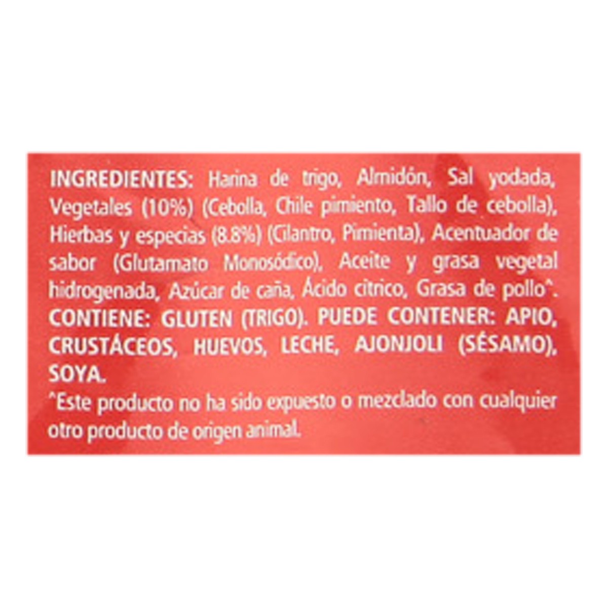 Wheat Flour, Corn Starch, Salt, Monosodium Glutamate, Coriander, Onion, Hydrogenated Palm Oil, Green Bell Pepper, Sugar, Onion Stem, Citric Acid, Chicken Fat (This Product Has Not Been Exposed to or C…