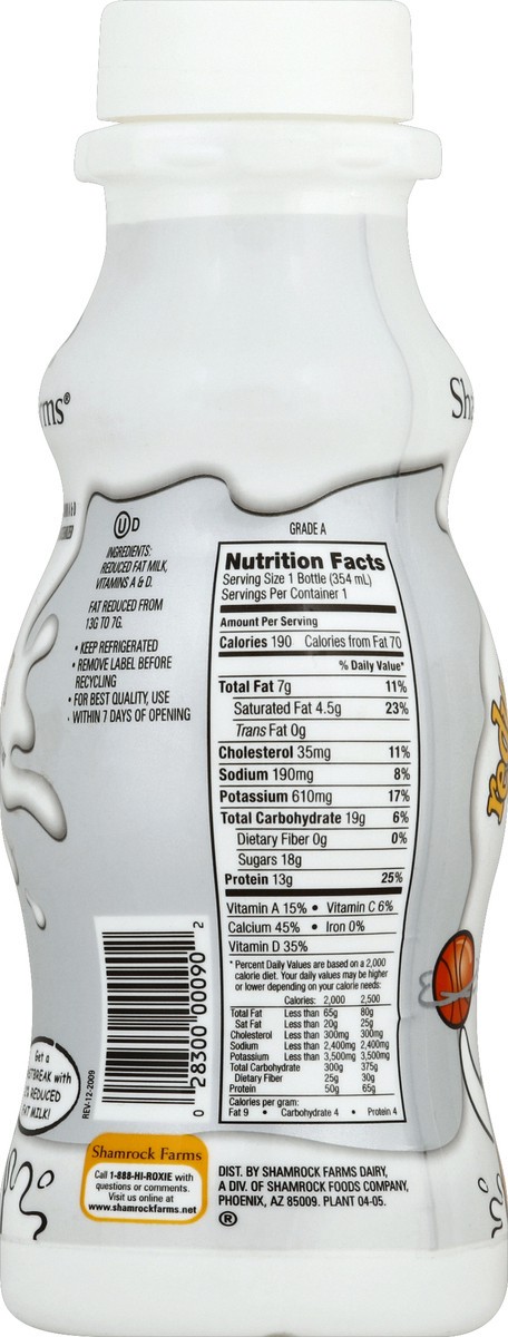 38% less fat than whole milk. Fat reduced from 13 g to 7 g. Vitamins A & D. Ultra-pasteurized. We pledge not to treat our cows with growth hormone rBST (No significant difference has been shown betwee…