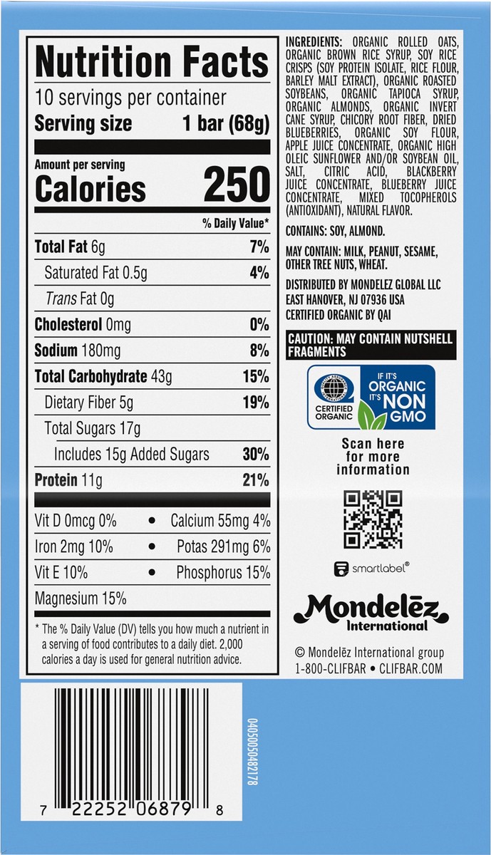 - BLUEBERRY CRISP FLAVOR: Includes one 10-pack box of Blueberry Almond Crisp energy bars made with organic almonds and dried blueberries for a fruity favorite on-the-go (packaging may vary)