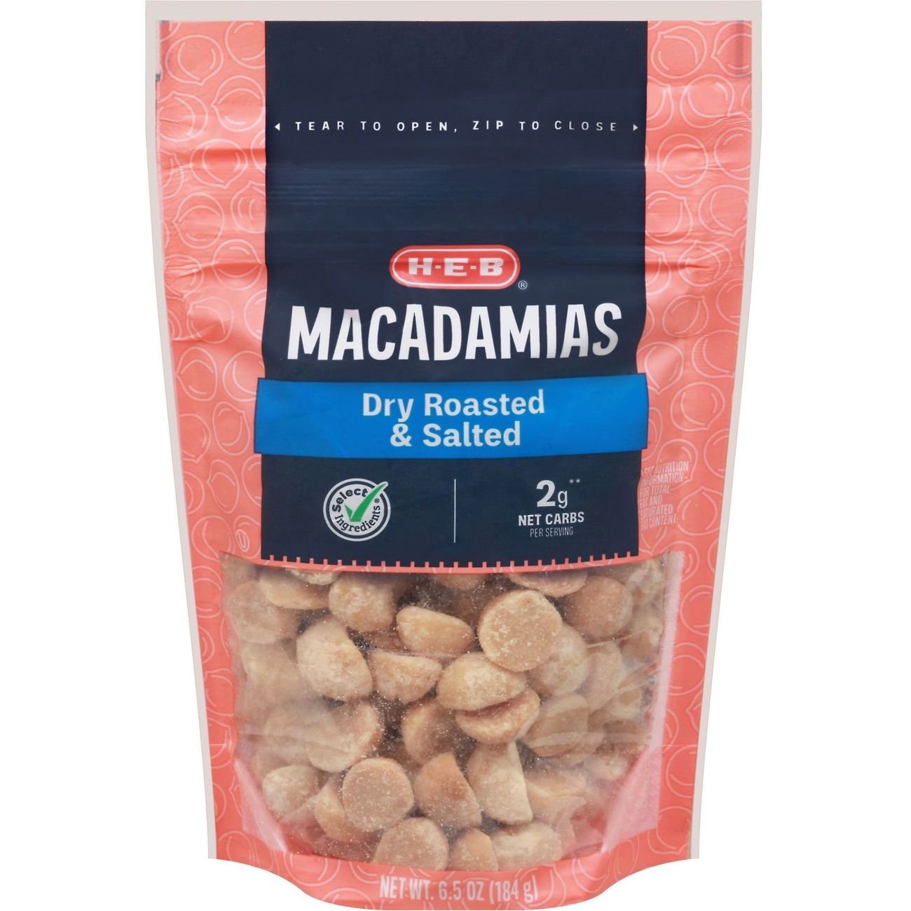 Treat your taste buds to the sweet buttery taste of H-E-B dry roasted macadamia nuts. Made with sea salt, they're a munchy, crunchy snack and come in handy for making white chocolate macadamia nut coo…