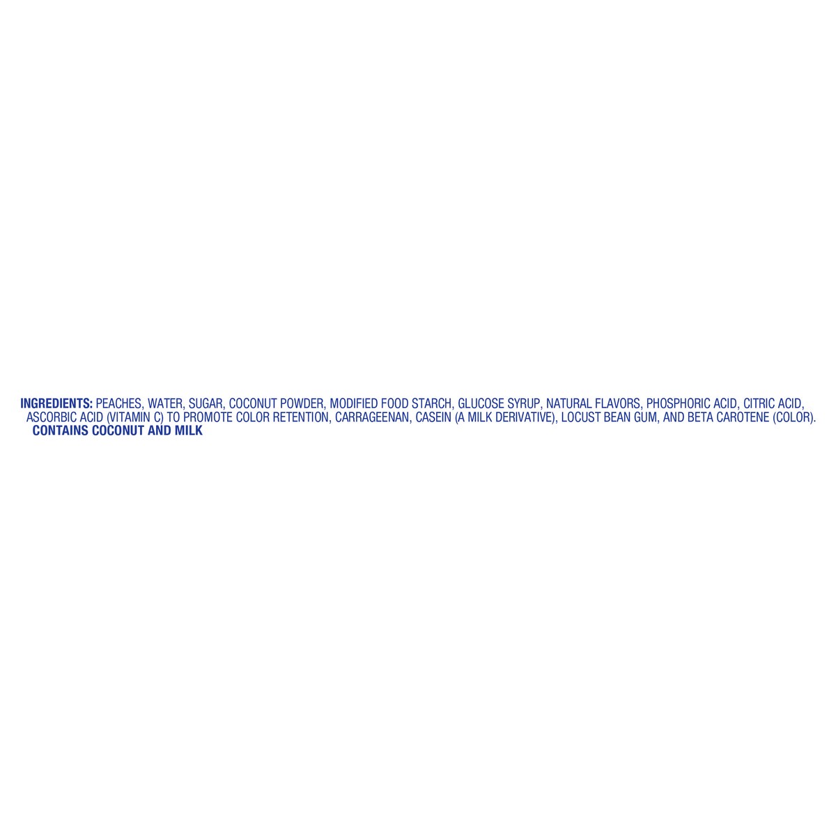 Peaches, Water, Sugar, Coconut Powder, Modified Food Starch, Glucose Syrup, Natural Flavors, Phosphoric Acid, Citric Acid, Ascorbic Acid (Vitamin C) to Promote Color Retention, Carrageenan, Casein (a …