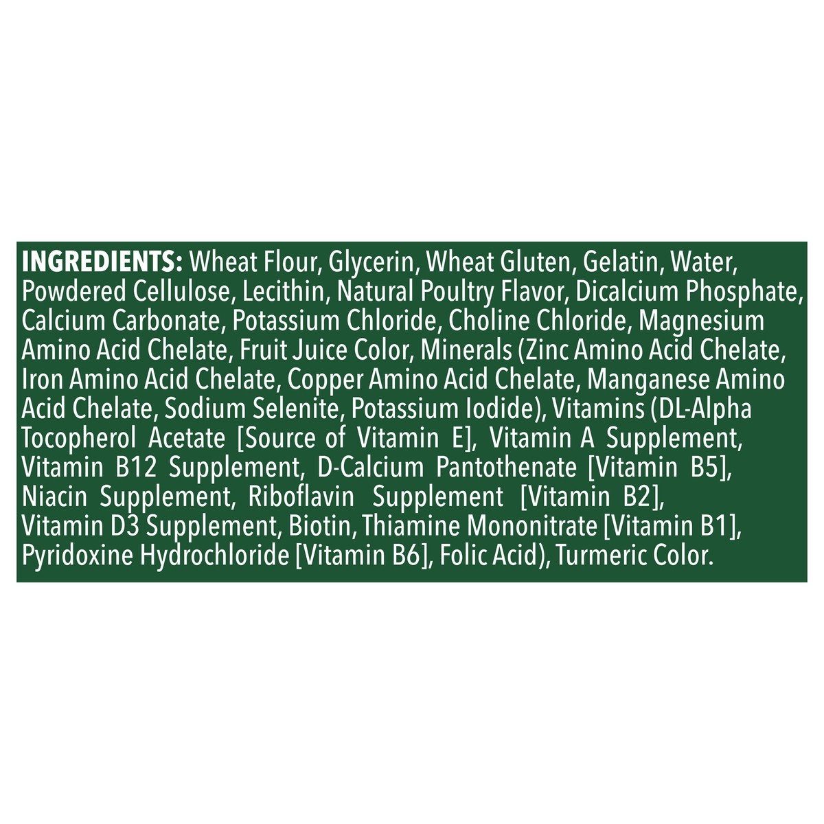 Wheat Flour, Glycerin, Wheat Gluten, Gelatin, Water, Powdered Cellulose, Lecithin, Natural Poultry Flavor, Dicalcium Phosphate, Calcium Carbonate, Potassium Chloride, Choline Chloride, Magnesium Amino…