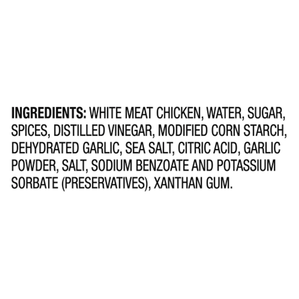 White Meat Chicken, Water, Sugar, Spices, Distilled Vinegar, Modified Corn Starch, Dehydrated Garlic, Sea Salt, Citric Acid, Garlic Powder, Salt, Sodium Benzoate and Potassium Sorbate (Preservatives),…
