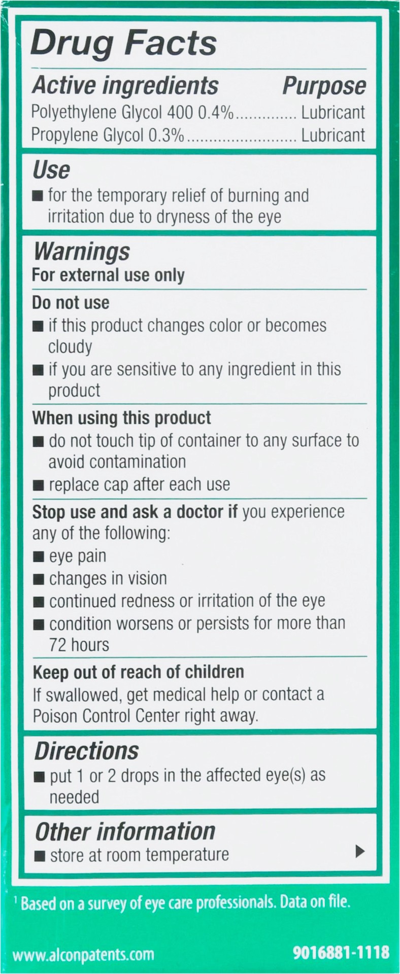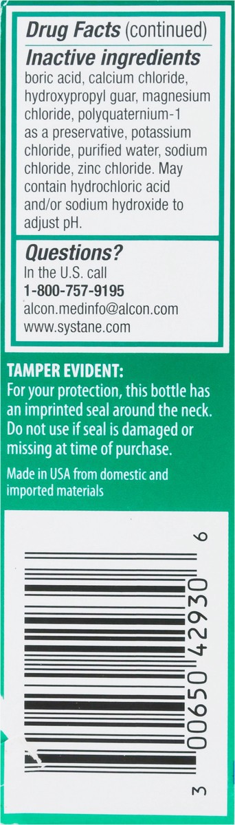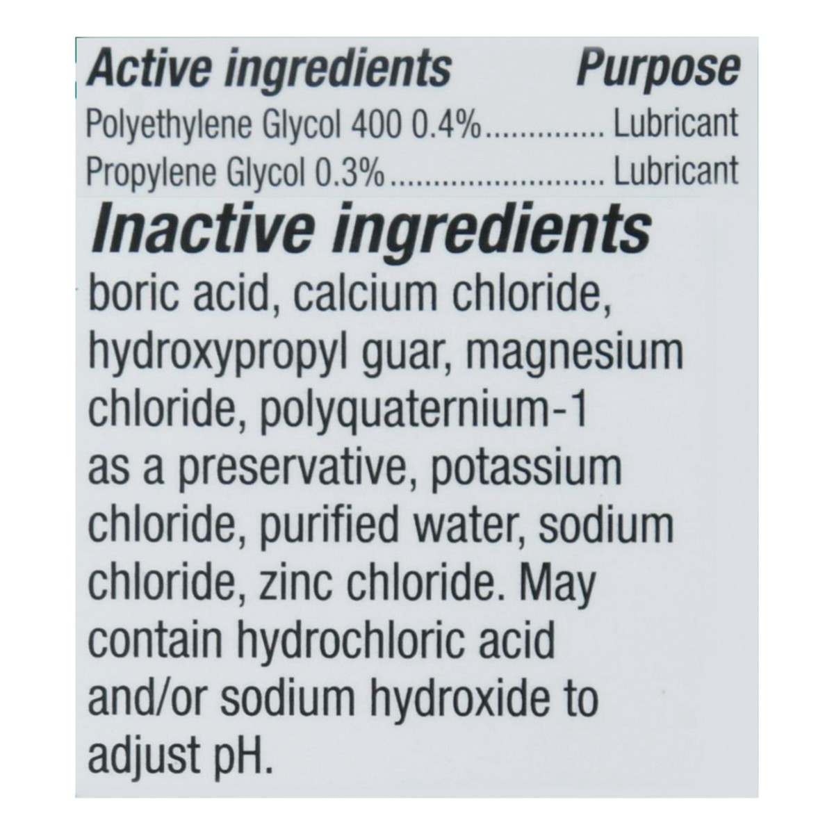 Active Ingredients: Polyethylene Glycol 400 (0.4 %), Lubricant; Propylene Glycol (0.3 %), Lubricant. Inactive Ingredients: Boric Acid, Calcium Chloride, Hydroxypropyl Guar, Magnesium Chloride, Polyqua…
