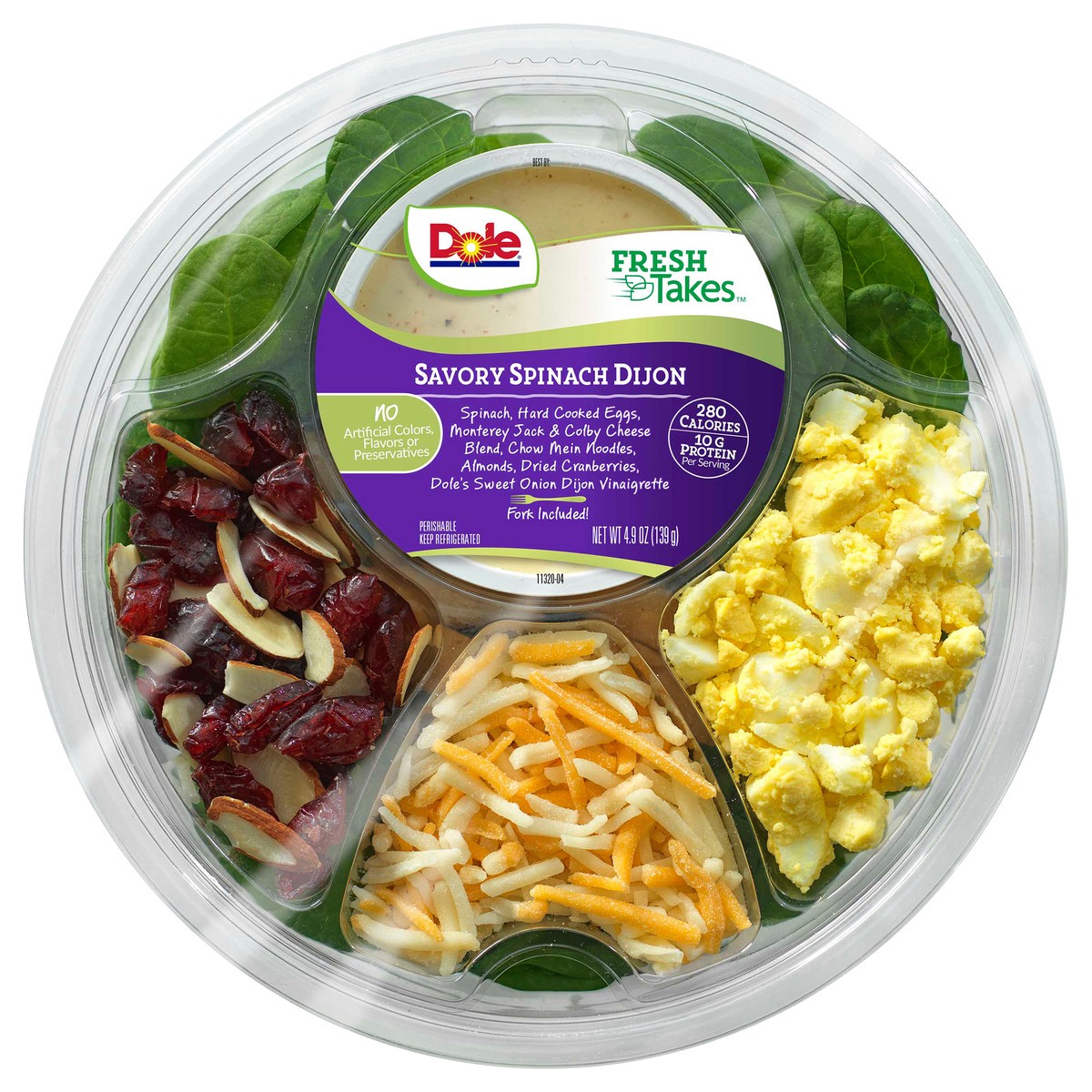 Spinach, Sweet Onion Dijon Vinaigrette (Water, Vegetable Oil [Canola and/or Soybean Oil], Sugar, Dijon Mustard [Distilled Vinegar, Water, Mustard Seed, Salt, White Wine, Citric Acid, Turmeric, Tartari…