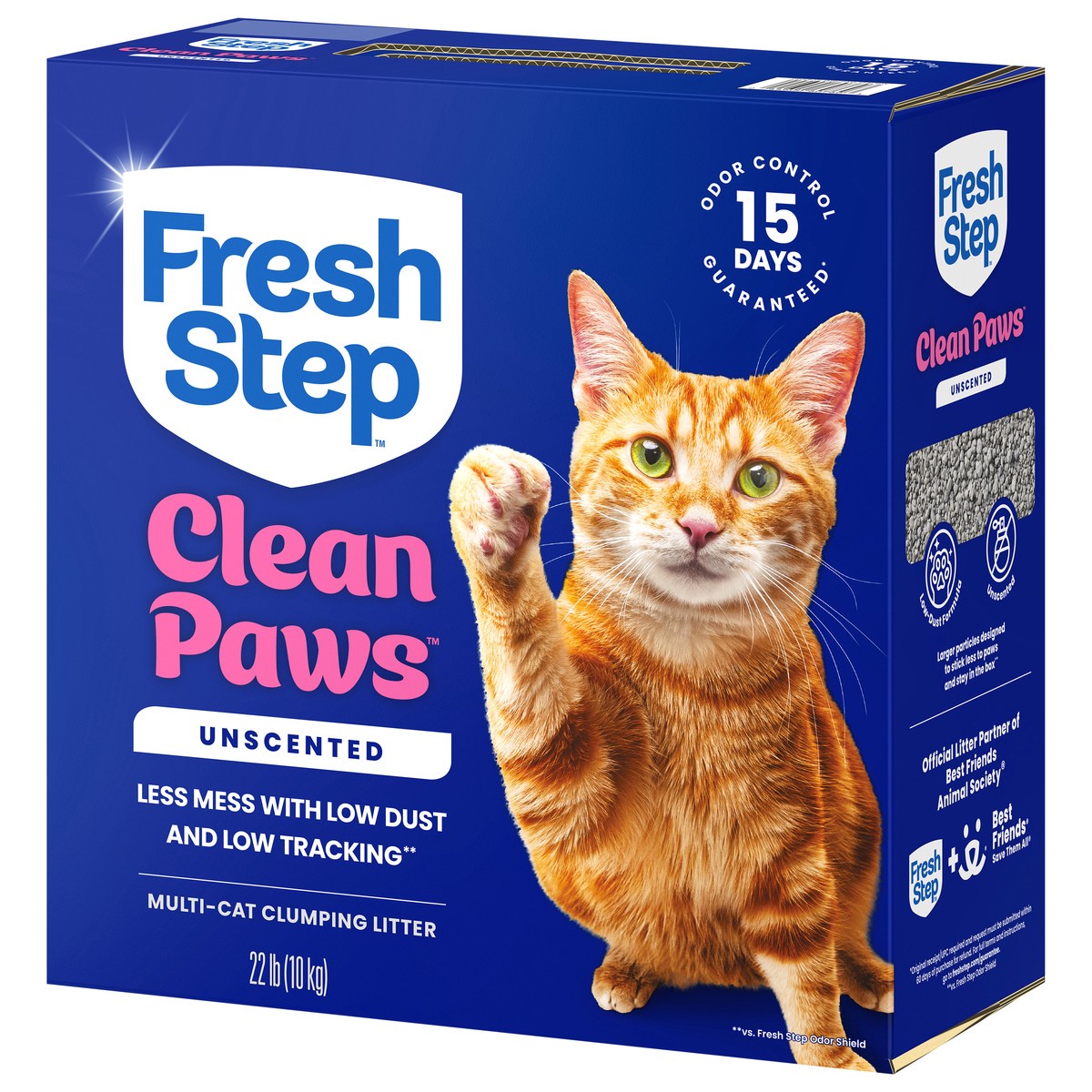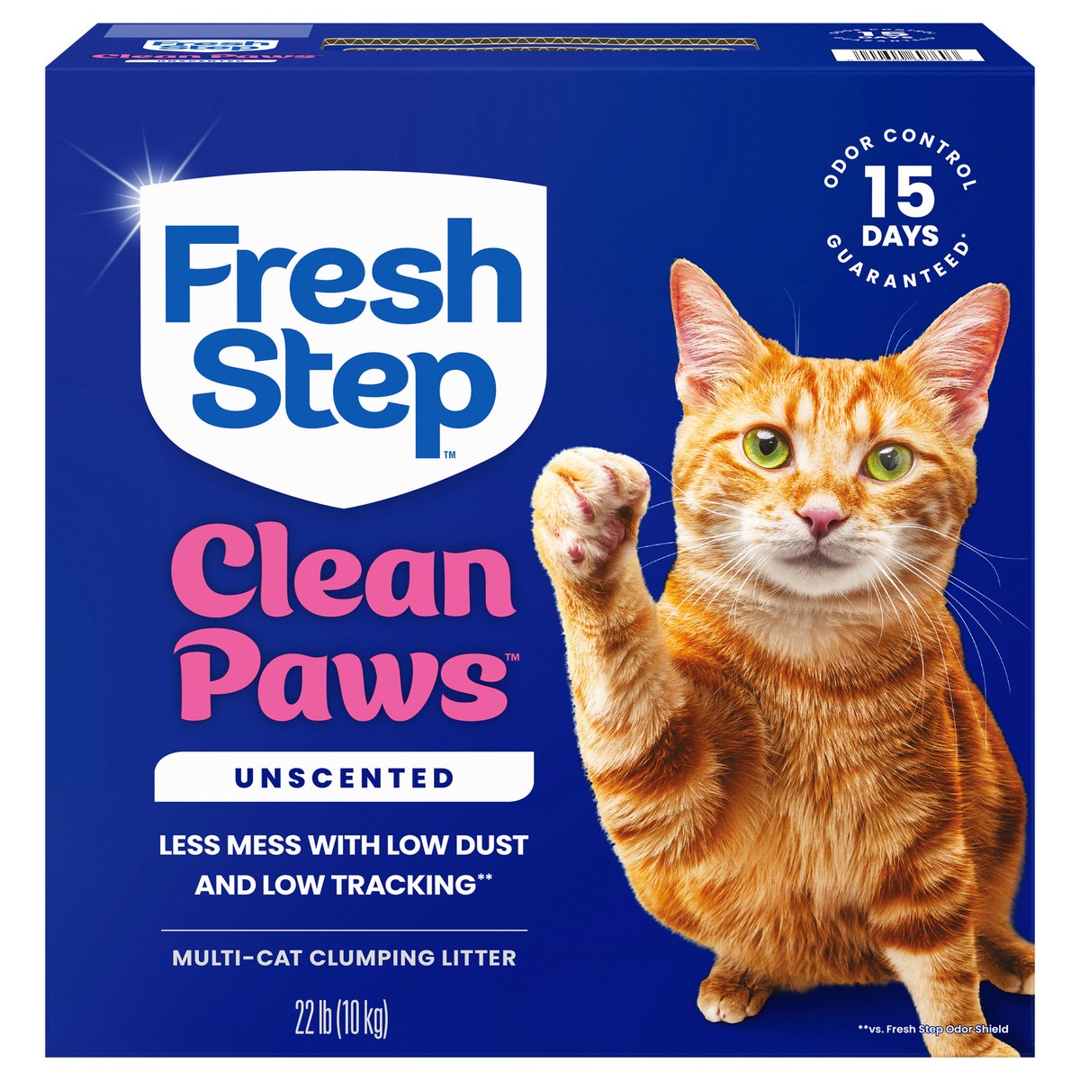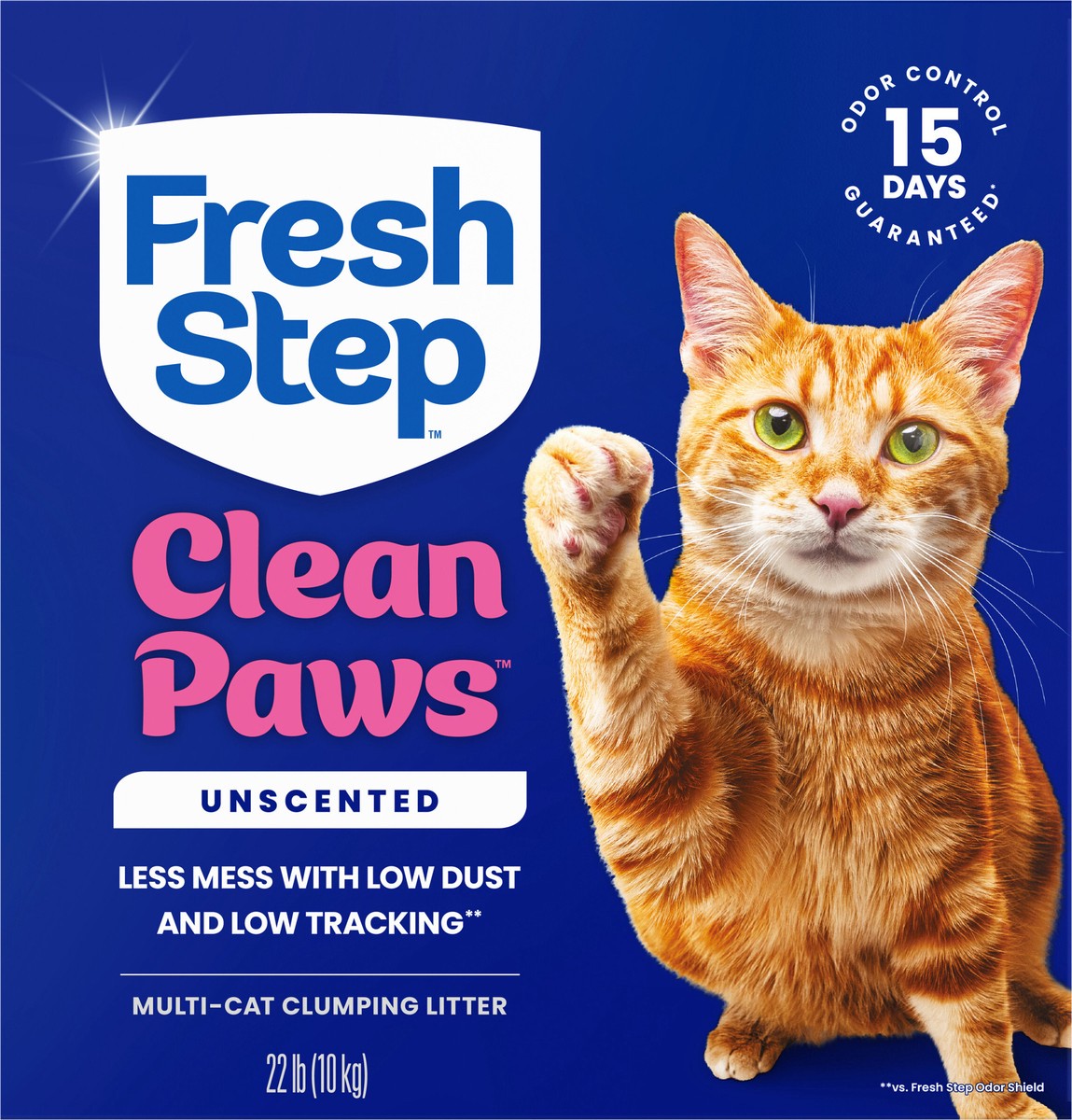 - CLEAN PAWS CAT LITTER: Unscented Fresh Step Clean Paws Multi Cat Clumping Litter gives you less mess with low dust and low tracking particles; packaging may vary