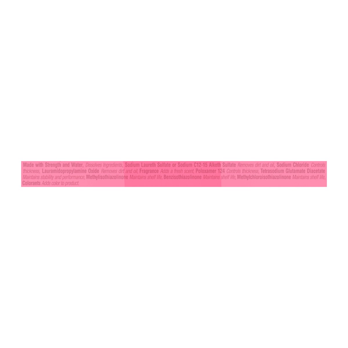 Sodium Laureth Sulfate or Sodium C12-15 Alketh Sulfate, Sodium Chloride, Lauramidopropylamine Oride, Fragrance, Paloxamer 124, Tetrasodium Glutamate Diacetate, Methylisothiazolinone, Benzisothiazolino…
