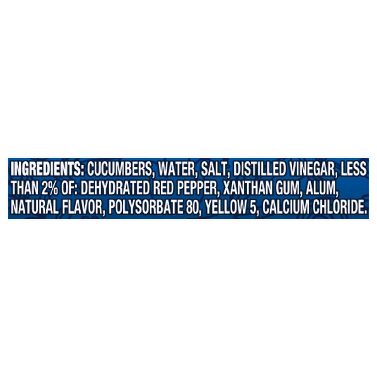 Cucumbers, Water, Salt, Distilled Vinegar, Less than 2% of: Dehydrated Red Pepper, Xanthan Gum, Alum, Natural Flavor, Polysorbate 80, Yellow 5, Calcium Chloride.