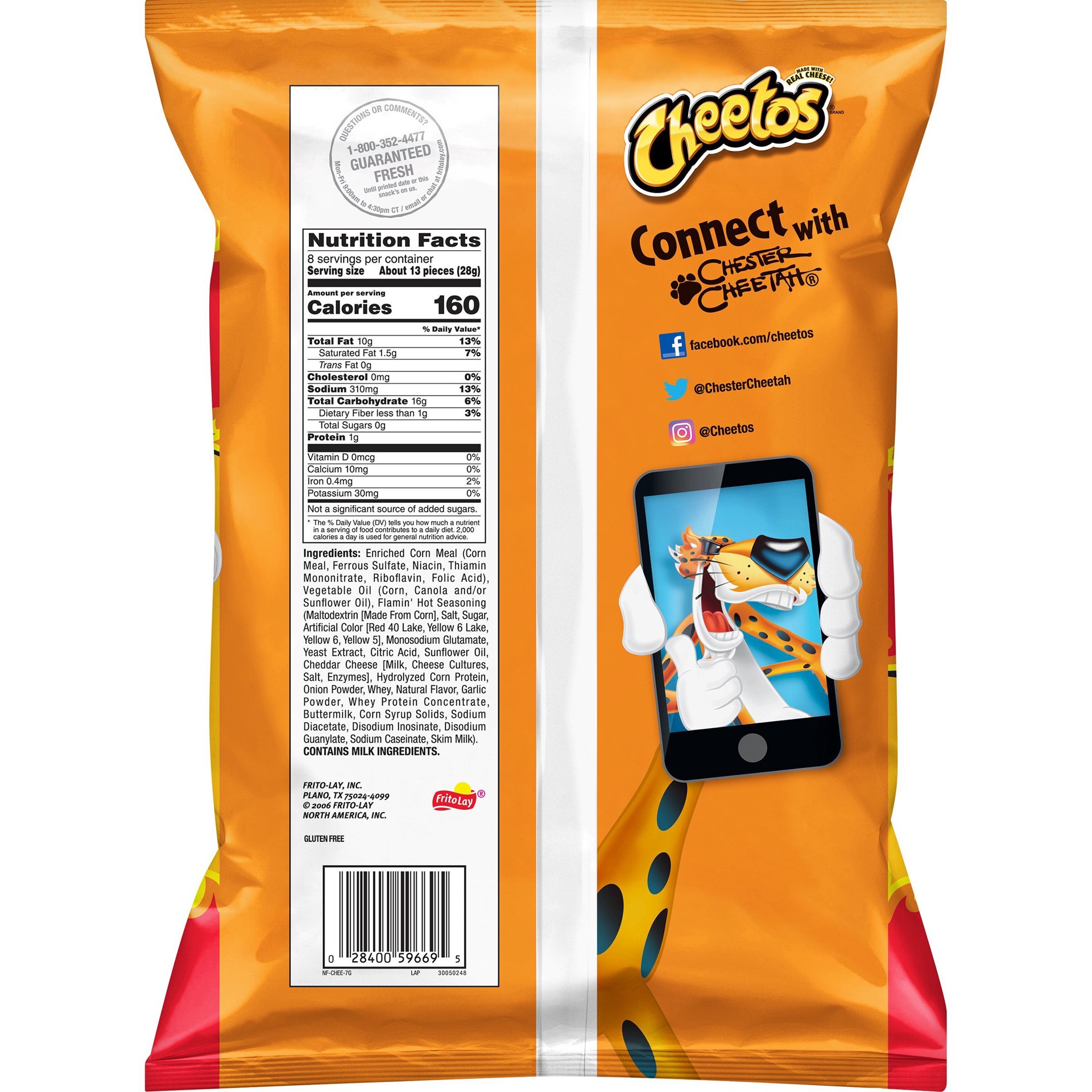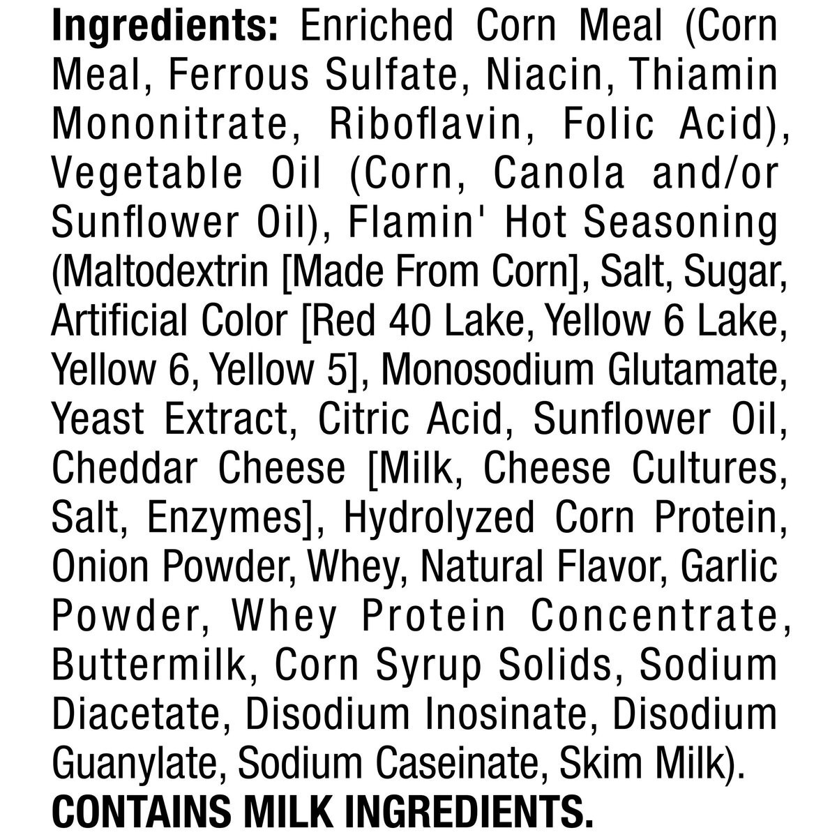 Ingredients: Enriched Corn Meal (Corn Meal, Ferrous Sulfate, Niacin, Thiamin Mononitrate, Riboflavin, Folic Acid), Vegetable Oil (Corn, Canola and/or Sunflower Oil), Flamin'' Hot Seasoning (Maltodextr…