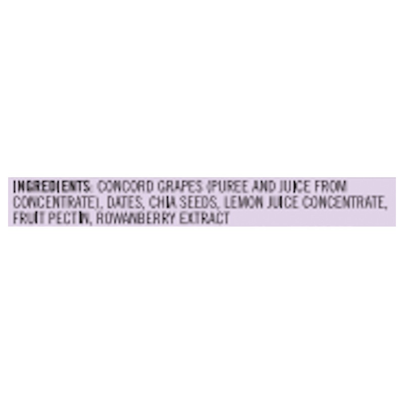 Concord Grapes (Puree and Juice from Concentrate), Dates, Chia Seeds, Lemon Juice Concentrate, Fruit Pectin, Rowanberry Extract.