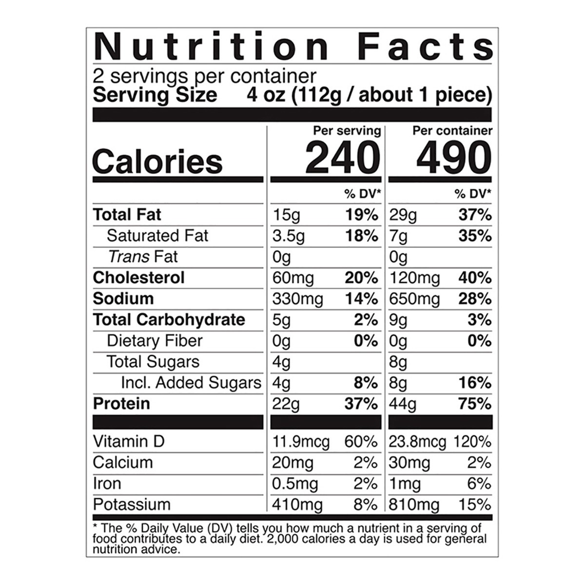 Atlantic Salmon (Color Added), Water, Sugar, Contains Less than 2% of the Following: Salt, Dill Weed, Black Pepper, White Pepper, Red Pepper, Spices, Lemon Flavor (Maltodextrin, Lemon Juice Concentrat…