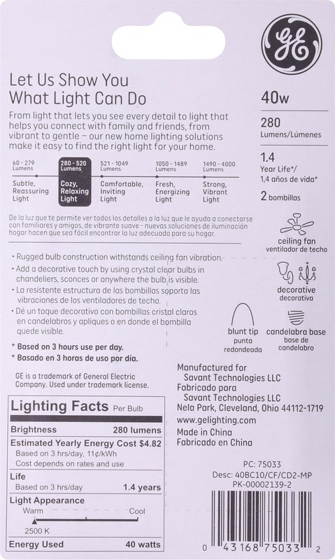Brightness Quantity: 280 lumens. Energy Info: $4.82 bases on 3 hrs/day, 11 cent/kWh. Cost depends on rates and use. 40 watts. Package Info: 2-Pack. 2. Voltage: 120 volts. Bulb Info: Indoor. Screw. Bul…