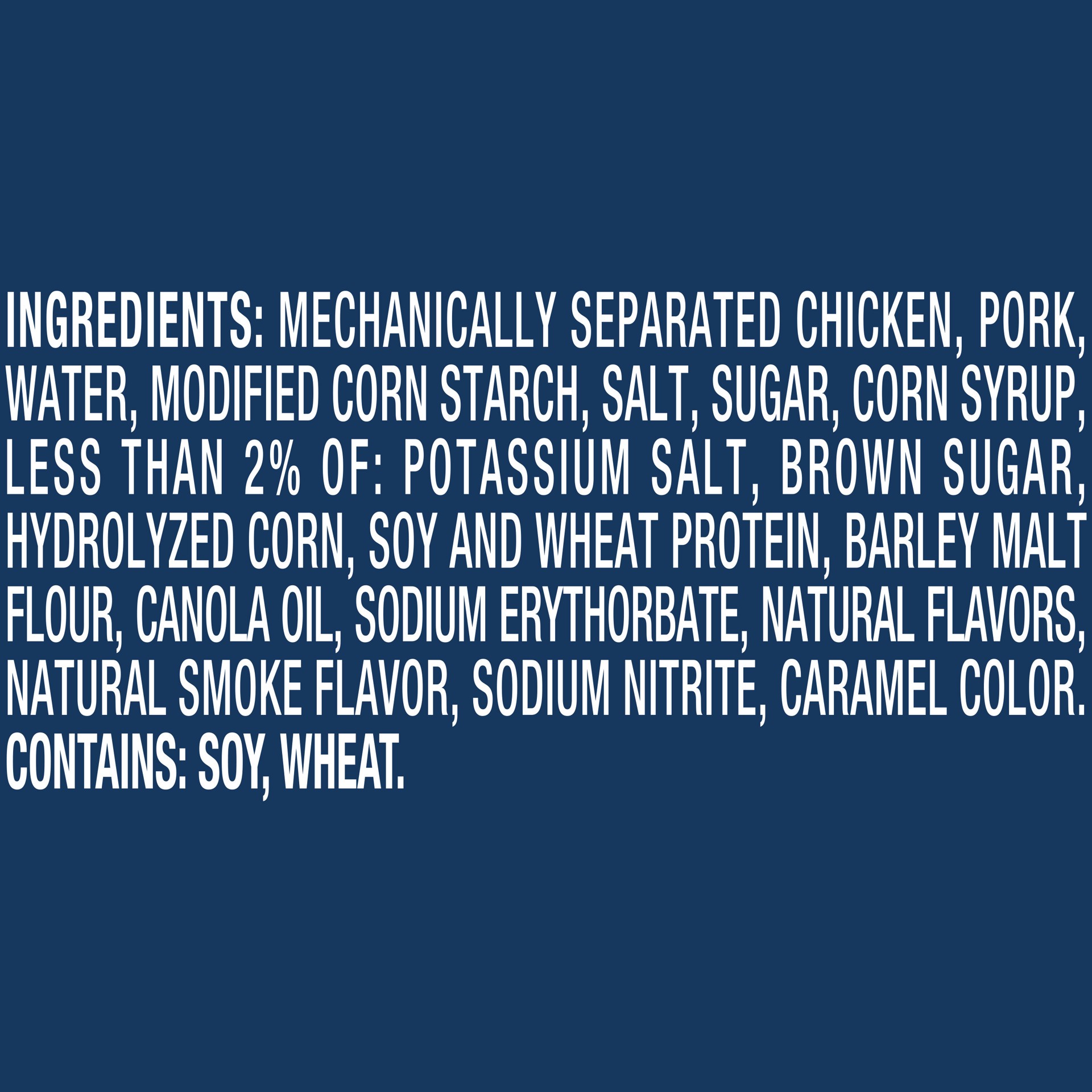 Mechanically Separated Chicken, Pork, Water, Potato Starch, Contains 2% or Less of: Baked Ham Seasoning (Sugar, Salt, Soybean Oil, Hydrolyzed Corn Protein, Barley Flour, Smoke Flavoring), Salt, Brown …